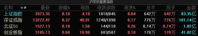中信证券:展望明年,多种因素仍然很可能主导金价上行 | | | | 沪深京重要指数 | | | | | --- | --- | --- | --- | --- | --- | --- | | 名称 *● | 最新 | 涨幅% | 涨跌 | | 总手 | 金额 | | 上证指数 | 3973.35 | 0.10 | 4.10 1010/845 | 0.04 | 642万 | 642万 83.35亿 | | 深证成指 | 13272.47 | 0.37 | 48.91 1240/1090 | 0.17 | 7767 | 776万 101.14亿 | | 北证50 | 1527.13 | 0.10 | 1.56 144/110 | 0.26 | 8.747 | 8.74万 1.82亿 | | 创业板指 | 3185.13 | 0.60 | 18.90 603/587 | 0.18 | 170万 | 170万 41.02亿 | 外盘市场: 随着特朗普关税在美国高院遭到尖锐质询,叠加AMD等高估值科技股迎来抄底资金入场,美股三大股 指均在周三小幅收涨。截至收盘,标普500指数涨0.37%,报6796.29点;纳斯达克综 ...