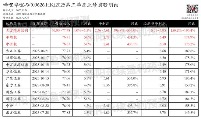预测公司Q3一致预期营业收入76.00~77.78亿元,同比增长4.0%~6.5%;预测净利润2.36~3.61亿元,同 比增长396.8%~554.0%;预测经调整净利润5.91~6.93亿元,同比增长150.2%~193.4%。 来源:朝阳永续 1. 最近拟披露财报发布日 哔哩哔哩-W(09626.HK)预计将于2025年11月13日公布2025年三季报。 2. 哔哩哔哩-W第三季度业绩预期怎么样? 截至目前,根据朝阳永续季度业绩前瞻数据: 3. 哔哩哔哩-W最新卖方观点 国盛证券认为:哔哩哔哩-W在2025年二季度录得收入73亿元,同比增长19.8%。移动游戏、增值服务、 广告和IP衍生品及其他业务分别实现收入16亿元、28亿元、24亿元和4亿元,同比增长60.1%、10.6%、 20.2%和-14.8%。公司毛利润为27亿元,同比增长46.0%,毛利率达36.5%。non-GAAP归母净利润约5.6 亿元,non-GAAP净利润率约7.7%。用户规模创新高,日均活跃用户达1.09亿,同比增长7%,月均活跃 用户达3.63亿,同比增长8%。月均付费用户超3100万,同比增长9%。广告业务保持强劲增长,效 ...