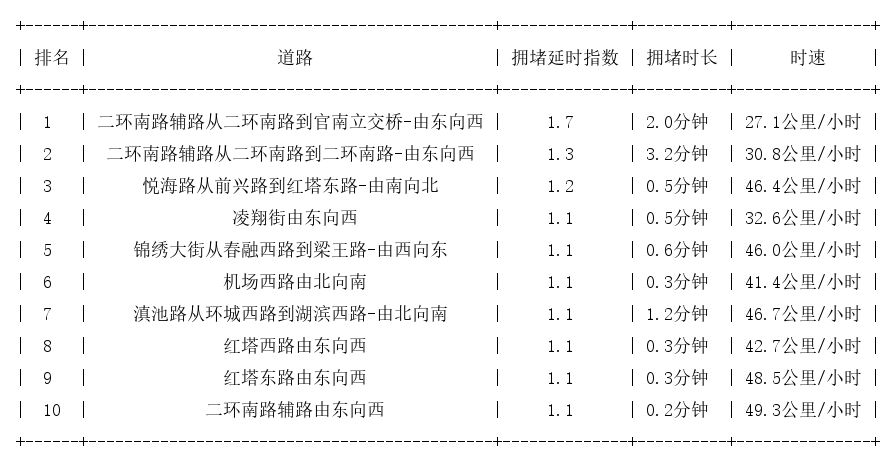 昆明早高峰交通状况 - 02月19日07时昆明早高峰整体交通呈现畅通状态 但二环南路辅路从二环南路到官南立交桥-由东向西方向拥堵最为严重[1] - 该最拥堵路段拥堵延时指数为1.7 通行时速仅为27.1公里/小时[1] 道路拥堵排行榜TOP10详情 - 根据排行榜 拥堵延时指数最高的前十条道路指数范围在1.1至1.7之间[1] - 排名第一的路段拥堵时长为2.0分钟 排名第二的路段拥堵时长为3.2分钟 其余上榜路段拥堵时长在0.2分钟至1.2分钟之间[1] - 上榜路段的通行时速差异较大 最低为27.1公里/小时 最高为49.3公里/小时[1]