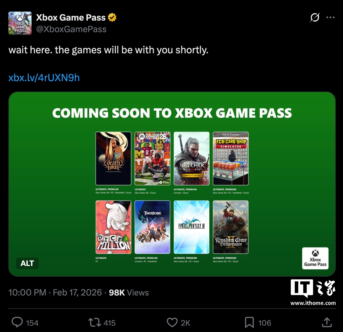 微软Xbox Game Pass内容更新 - 公司确认将于2026年2月第二波新增多款游戏至XGP阵容,包括《天国:拯救 2》和《最终幻想 3》等游戏 [1] - 公司同时公布了将于2月28日从XGP库中移除的游戏,合计4款作品,包括《怪物火车》、《远征:泥泞奔驰》、《不义联盟 2》和《中土世界:战争之影》 [7]