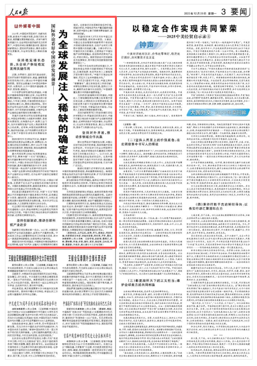 (武田景 以稳定合作实现共同繁荣 为全球发展注入稀缺的确定性(外媒看中国) 《人民日报》 (2025年12月29日 第 03 版) 2025年,中国经济顶压前行、向新向优发展,新质生产力稳步发展,改革开放扎实推进,高质量发展取 得新成效。多家外媒刊发报道认为,在全球经济复苏曲折乏力的背景下,中国经济将以稳健的基本面、 强劲的创新驱动力、坚定的开放姿态,携手各国共同发展繁荣,为全球发展注入稀缺的确定性。 保持稳定增长态势,为全球产供链稳定发挥关键作用 近期,世界银行、国际货币基金组织、亚洲开发银行等国际组织,高盛、德银等国际投资机构分别上调 2025年中国经济增速预期。国际社会普遍认为中国经济稳中向好、长期向好,认为中国经济基础稳、优 势多、韧性强、潜能大。 国际舆论看好中国经济发展前景 -- 3 要闻 今日哈萨克斯坦通讯社报道说,中国经济继续保持稳定增长态势,为全球带来急需的确定性。文章援引 中国海关统计数据说,今年前三季度,中国货物贸易进出口总值同比增长4%,展现出强劲韧性。面对 经济全球化逆风加剧,中国出口产品创新性提升、对外贸易新动能增强,为维护全球产业链供应链的稳 定发挥关键作用。 英国天空新闻台阿拉 ...