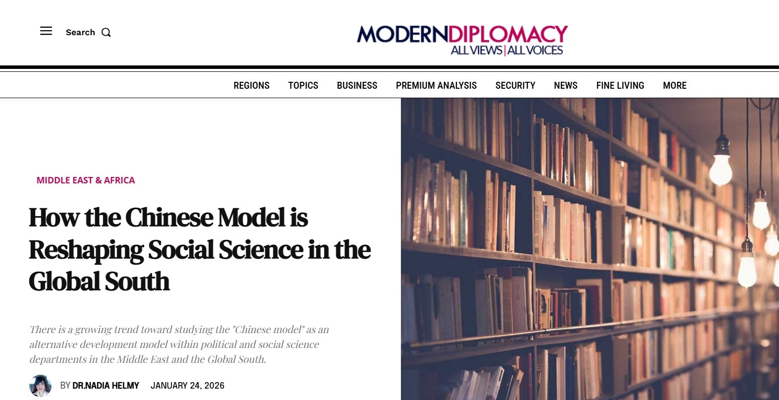 欧洲《现代外交》近日刊登埃及本尼苏伊夫大学副教授纳迪亚·赫尔米博士的署名文章《中国模式如何重塑全球南方社会科学》。作者在文章中表示, 在全 球南方国家高校的政治与社会科学院系中,将"中国模式"作为一种替代发展模式展开研究的趋势正日益凸显。 《现代外交》网站报道截图 作者表示,全球南方发展中国家越来越重视发展政治和社会科学课程,以反映新的全球现实。相关国家正着力将 "全球全面合作""共同发展""中国模式" 等 理念纳入其教育课程体系,这在埃及、阿拉伯国家及非洲各国的高校尤为突出。作者举例说,这些调整包括开设《中国外交政策》《"一带一路" 经济学》 《世界新秩序》等课程,重点选用中国及 "一带一路" 共建国家的应用案例展开研究。 作者认为,这些国家高校调整社会科学课程的根本原因在于,发展中国家迫切希望推动全球力量格局的重构。中国作为全球主要经济大国崛起,使得对其发 展模式的研究成为必然要求。同时,各国也在持续对西方模式展开反思,尤其是在认识到美国等西方模式并非总能在全球南方实现可持续、全方位的发展之 后,这一趋势更为显著。与此同时,发展中国家也渴望树立自主的发展定位,制定契合自身发展现实和愿景的政策。 作者同时指 ...