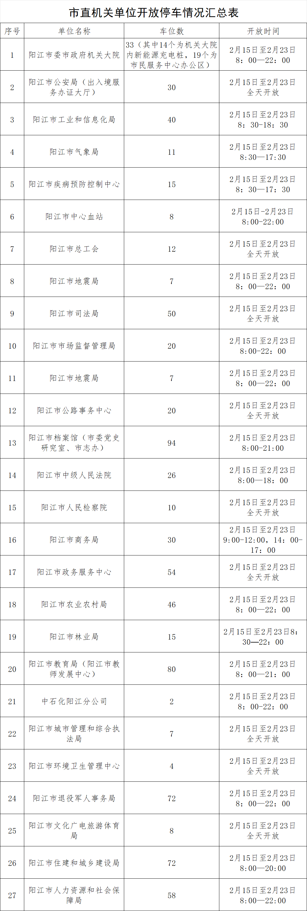 政策背景与核心举措 - 阳江市为提升2026年春节期间旅游服务质量,由市委办、市府办联合印发《全市春节期间旅游提质服务工作方案》,核心要求是加强节假日停车服务与管理,增加停车位供给,并重点加强海陵岛等热门旅游区域的停车管理 [1] - 方案明确要求有条件的机关单位、学校向社会公众免费开放部分停车场,同时加强停车秩序管理,严格整治乱停乱放行为 [1] - 全市相关部门、国企积极响应,盘活单位内部停车资源,统计核查后对外开放停车位,旨在满足群众停车需求、缓解交通出行不便,并以此展现阳江作为“中国优秀旅游城市”的良好形象 [1] 总体供给规模与时间 - 2026年春节期间,阳江市将有100多个机关单位、学校内部停车场及市政道路公共停车位面向社会公众开放 [1] - 全市拟对外开放的免费停车泊位总数超过9000个,其中市直机关开放27个单位,提供车位831个;县(市、区)共开放108个单位,提供车位8190个 [1] - 整体开放时间集中在2月15日至2月23日,但具体单位的开放时段有所不同,部分为全天开放,部分有特定时间限制 [1][3][4][5][6][7][8][10][11][12][13][14][15] 分区停车资源详情 - **江城区市政道路**:于2月16日0时至24时开放,共涉及37条市政道路的临时停车泊位 [1] - **市直单位**:共27个单位提供车位,例如阳江市委市政府机关大院33个、市公安局30个、市工业和信息化局40个、市档案馆94个、市教育局80个、市住建局72个等,开放时间多在2月15日至23日,具体时段各异 [3][4][5] - **江城区单位**:包括城北办公区(150个)、多个街道办事处及镇政府(各40-100个不等)、以及南排小学(25个)、共青湖学校(100个)等,开放时间多为每日8:00-20:00 [6] - **阳东区单位**:共14个单位,提供车位约530个至180个不等,例如阳东区人民政府约530个、阳东区体育馆约180个,开放时间多为每日8:00-20:00或全天 [6][7] - **阳江滨海新区(阳江高新区)**:共10个单位,提供车位20至200个不等,其中海陵区政务服务中心200个、高新区平冈镇政府100个、海陵区闸坡镇政府100个,开放时间多为全天或每日特定时段 [8] - **阳春市**:共34个单位,提供车位8至200个不等,例如行政服务中心200个、岗美镇政府及周边174个、永宁镇政府104个,开放时间多为全天或每日特定时段 [10][11][12] - **阳西县**:共41个单位,提供车位4至670个不等,其中县机关事务处(县委县政府大院)670个、阳西县第一中学583个、程村镇人民政府340个,开放时间均为2月15日至23日全天 [12][13][14][15]