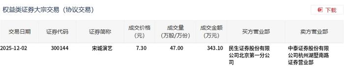 | 权益类证券大宗交易(协议交易) | | --- | | 交易日期 | 证券代码 | 证券简称 | 成交价格 (元) | 成交量 (万股/万份) | 成交金额 (万元) | 买方营业部 | 卖方营业部 | | --- | --- | --- | --- | --- | --- | --- | --- | | 2025-12-02 | 300144 | 宋城演艺 | 7.30 | 47.00 | | 343.10 民生证券股份有限 | 中泰证券股份有限 | | | | | | | | 公司北京第一分公 | 公司杭州湖暨南路 | | | | | | | | 리 | 证券营业部 | 12月2日,宋城演艺大宗交易成交47万股,成交额343.1万元,占当日总成交额的1.61%,成交价7.3元, 较市场收盘价8.07元折价9.54%。 ...