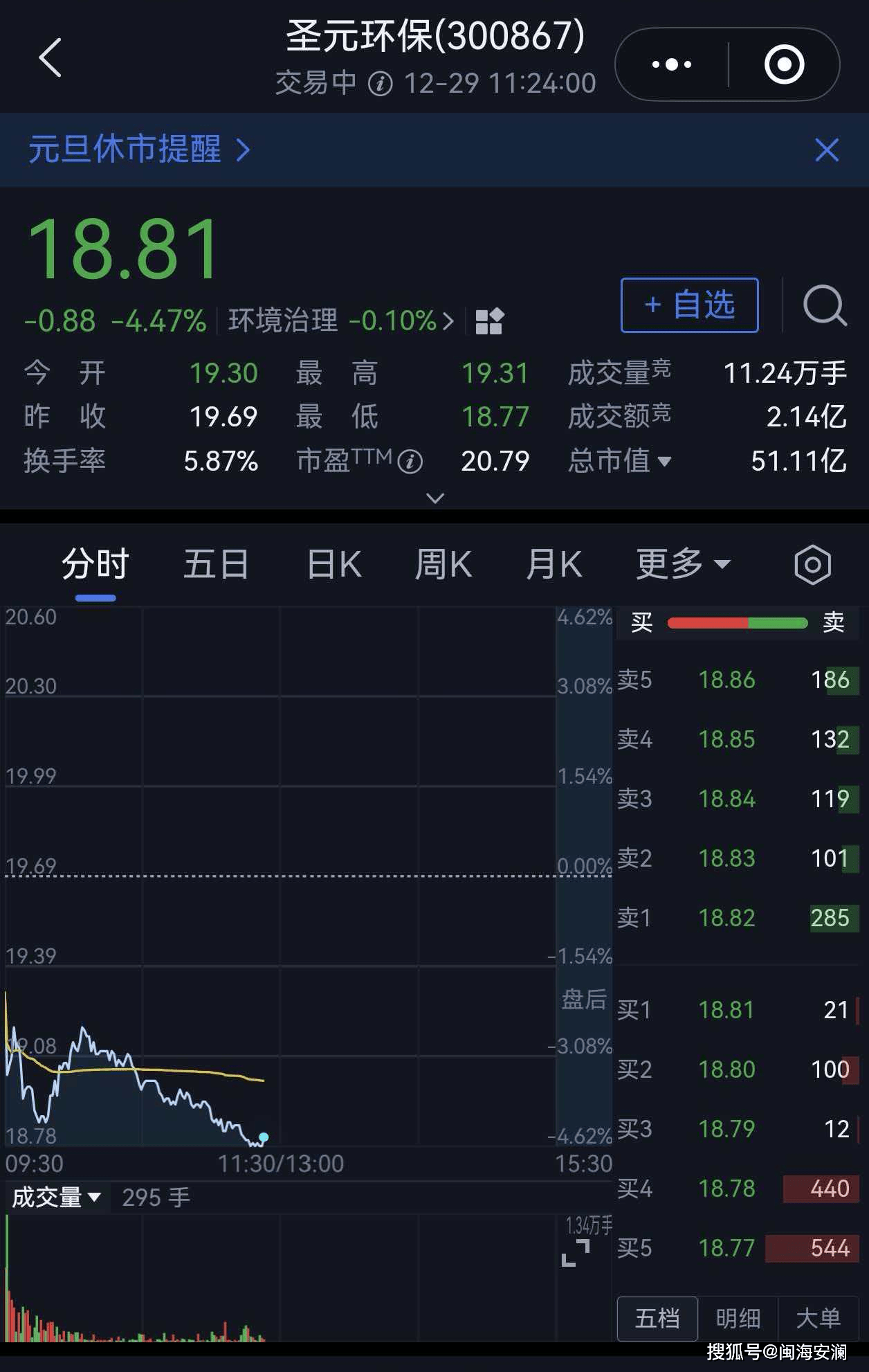 圣元环保(300867) 交易中 (2 12-29 11:24:00 元旦休市提醒 > | 18.81 | | | | | --- | --- | --- | --- | | | + 自选 -0.88 -4.47% 环境治理 -0.10%> | | | | 今 开 | 19.30 最 高 = 19.31 | 成交量克 | 11. | | 昨 收 | 19.69 最低 18.77 | 成交额克 | | | 换手率 | 5.87% 市盈TM 7 20.79 | 总市值▼ | | | | > | | | | 分时 | 五日 日K 周K 月K 更多▼ | | | | 20.60 | | 4.62% = C | | | 20.30 | | 3 08% 买5 | 18.86 | | | | 324 | 18.85 | | 19.99 | | 1.54% | | | | | 323 | 18.84 | | 19.69. | | 0 00% 关4 | 18.83 | | | | 호1 | 18.82 | | 19.39 | | 1.54% | | | | | 买1 3.08% | 18.81 | | | | 252 | 18 ...