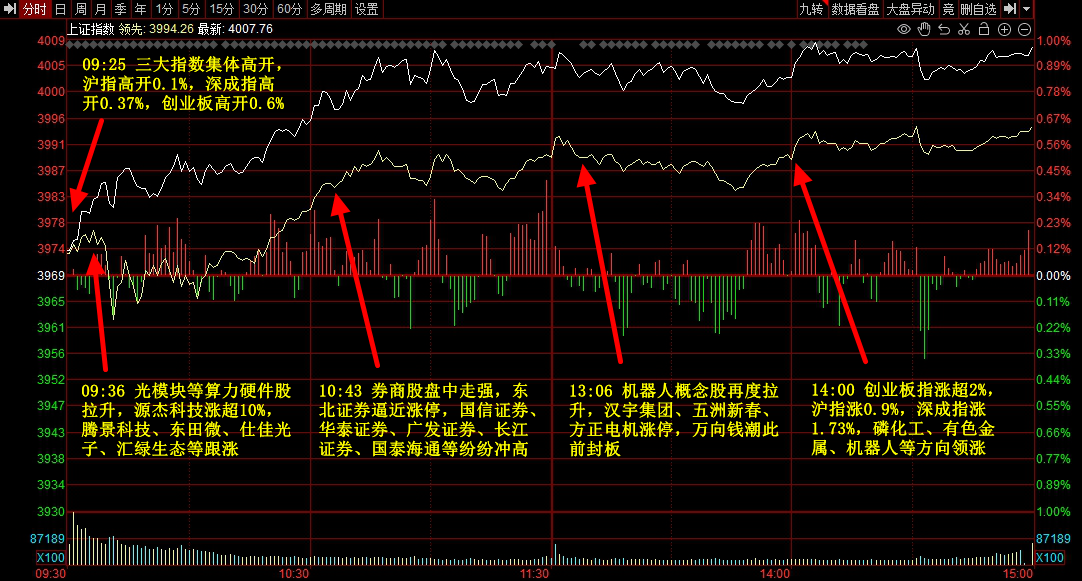 11月6日,上证指数、科创50指数早盘高开高走,午后持续走强,上证指数再度突破4000点;深证成 指、创业板指早盘一度冲高回落,随后再度上扬,午后震荡走强。截至收盘,上证指数报4007.76点, 涨0.97%,成交额9303亿元;深证成指报13452.42点,涨1.73%,成交额11249.72亿元;创业板指报 3224.62点,涨1.84%,成交额5045.56亿元;科创50指数报1436.86点,涨3.34%,成交额910亿元。沪深 两市合计成交20552.72亿元,成交额较上一交易日增加1829.64亿元。 涨停股中,从连续涨停天数来看,大于或等于2天的个股有18只。其中,ST中迪15连板,连续涨停板数 量最多;*ST宝鹰9连板;合富中国8连板;*ST东易7连板;ST雪发、*ST中地均5连板;海陆重工4连 板;闽东电力、摩恩电气、ST起步均3连板;太阳电缆、顺钠股份、恒大高新、洪兴股份、保变电气等 8股均2连板。 沪深两市主力资金净流出37.98亿元 9个行业主力资金呈现净流入 Wind统计显示,沪深两市主力资金今日净流出37.98亿元;其中,创业板主力资金净流入9.53亿元;沪 深300成份股主力资金 ...