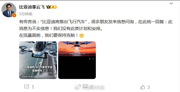 【#比亚迪回应将推出飞行汽车#:不实信息】针对网传"比亚迪将推出飞行汽车"得消息,@比亚迪李云 飞 发文回应称,"此消息为不实信息!我们没有此类计划和安排。" ...