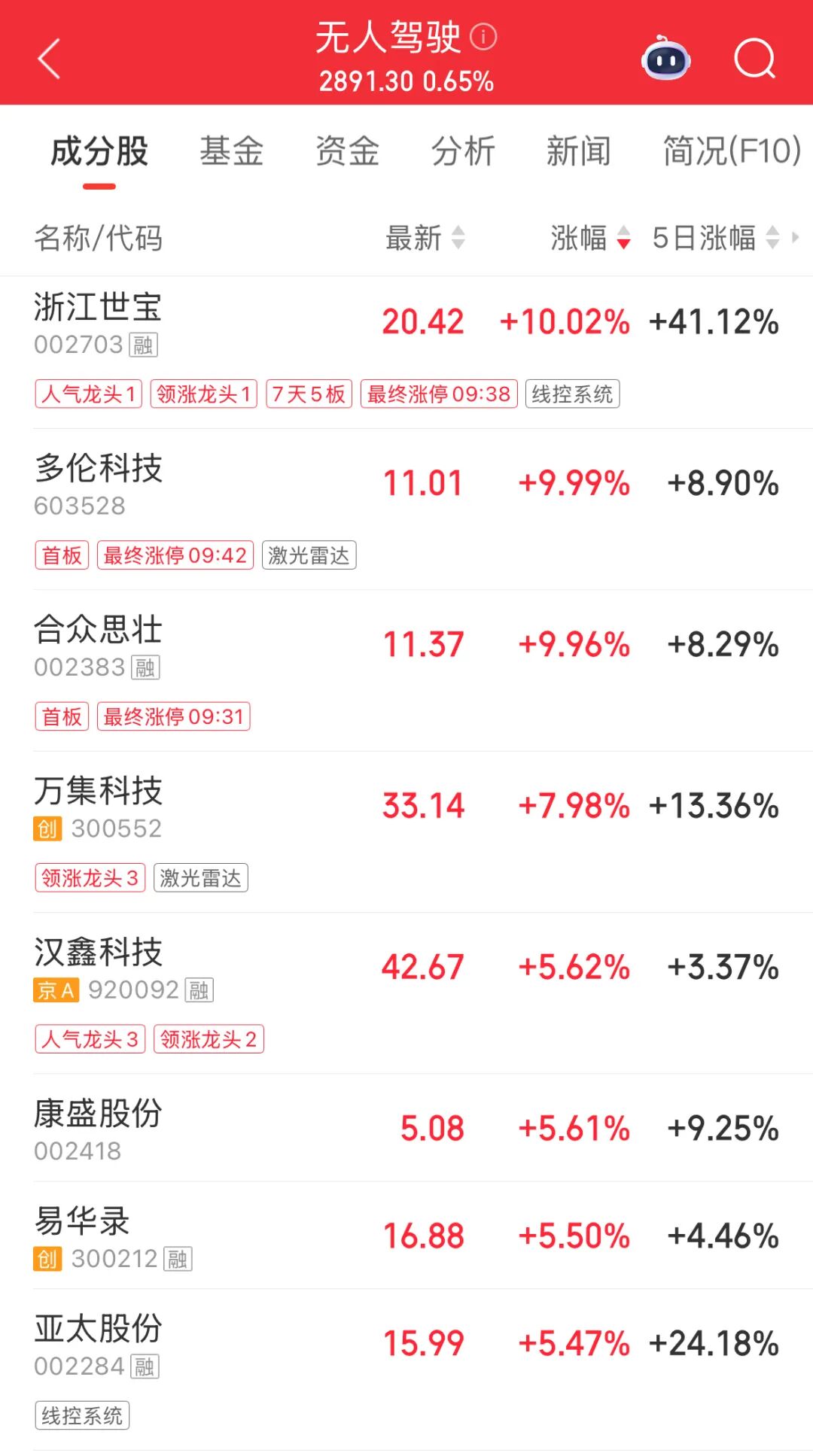 早盘,无人驾驶概念走强,多伦科技涨停,浙江世宝7天5板,合众思壮(002383)开盘仅用一分钟左右直线涨停,万集科技涨近8%,汉鑫科技、康盛股 份、易华录等多股跟涨。 | 002418 | | | | | | | --- | --- | --- | --- | --- | --- | | 易华录 | | | 16.88 | +5.50% +4.46% | | | 创 300212 融 | | | | | | | 亚太股份 | | | 15.99 | +5.47% +24.18% | | | 002284 融 | | | | | | | 线控系统 | | | | | | | | | V | 合众思壮 | | | | | | | 002383 融 深股通 L1 | | | | 11.37 | 间 | | 11.37 市值 84.18亿 量比 | | 6.88 | | | ਜ਼ਿੰ | | 流通 84.18亿 10.20 | 换 | 4.32% | | 1.03 9.96% | ਜੇ | | 10.26 市盈 ™ 写损 额 | | 3.60亿 | | 同在顺 | | | 异动解读: 低空经济+河南国资+北斗导航 + ...