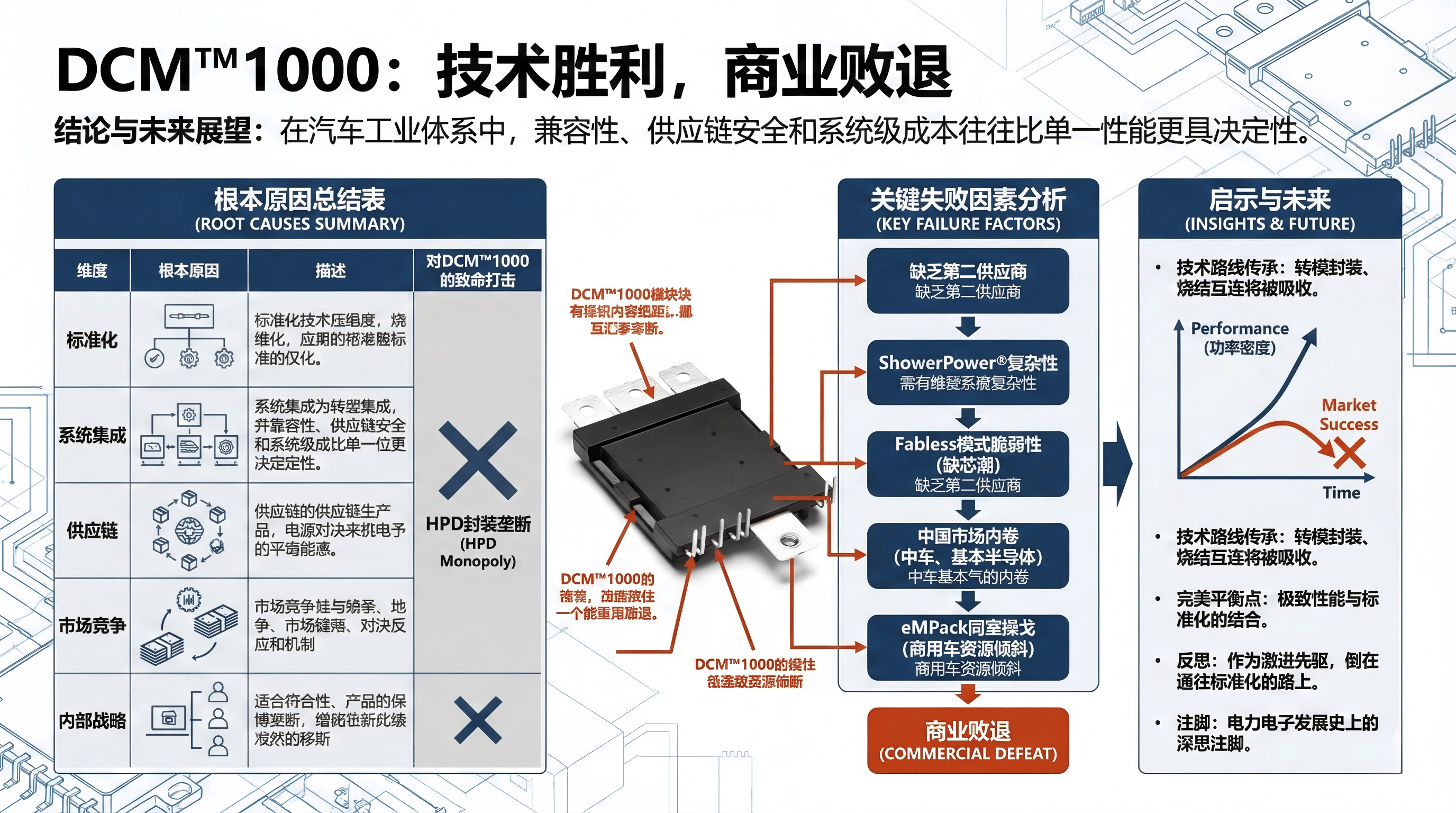 市场趋势分析:DCM™1000以及类似封装的SiC模块在电驱动领域遭遇淘汰的原因 | 根本原因总结表 | (ROOT CAUSES SUMMARY) | | | | | --- | --- | --- | --- | --- | | 对DCM™1000 | 描述 | 雄度 | 根本原因 | 的致命打后 | | 标准化技术压组度,烧 | 维化,应期的搭准脸标 | 标准化 | | | | 准的仅化。 | 101 | | | | | 系统集成为转型集成, | O | 并靠容性、供应链安全 | | | | 系统集成 | 和系统级成比单一位更 | O | | | | 决定定性。 | | | | | | 供应链的供应链生产 | HPD封装空断 | 供应等 | 品,电源对决来挑电予 | | | (HPD | 的平ත能感。 | Monopoly) | | | | DC | 73 | | | | | 市场竞争娃与鲸圣、地 | 市场竞争 | 争、市场链磨、对決反 | | | | 应和机制 | | | | | | 适合符合性、产品的保 | 内部战略 | 0 | 博堡断,增祝往新比续 | | | 发然的移斯 | | | | | 在全 ...
