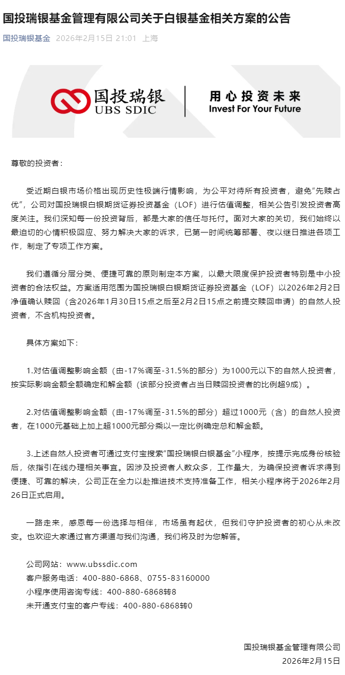事件概述 - 国投瑞银基金于2月15日晚间发布公告,针对旗下国投瑞银白银期货证券投资基金(LOF)因估值调整而受损的投资者,提出了具体的补偿方案 [1] - 此次事件源于1月30日贵金属市场的史诗级暴跌,现货白银价格盘中一度暴跌35.89%,收盘跌26.42% [4] - 为应对极端行情并公平对待投资者,国投瑞银基金于2月2日起对该基金净值依据国际市场价格进行重估,导致基金净值在2月2日单日暴跌31.50%,创下公募基金行业罕见的回撤纪录 [5] 补偿方案细节 - 对估值调整影响金额(由-17%调至-31.5%的部分)在1000元以下的自然人投资者,按实际影响金额全额确定和解金额,该部分投资者占当日赎回投资者的比例超过九成 [4] - 对估值调整影响金额超过1000元(含)的自然人投资者,和解金额为在1000元基础上,加上超出1000元部分乘以一定比例来确定 [4] - 相关自然人投资者可通过支付宝小程序“国投瑞银白银基金”办理补偿事宜,该小程序将于2026年2月26日正式启用 [4] 基金净值波动与估值调整 - 国投白银LOF在1月30日现货白银暴跌26.42%的当日,基金净值仅下跌0.72% [4] - 2月2日,公司宣布基金净值将依据国际主要市场价格波动进行重估,此举实质上突破了国内期货的涨跌停板限制 [5] - 受此影响,该基金单位净值在2月2日从3.2838元跌至2.2494元,单日跌幅达31.50% [5][6] - 估值调整后,基金净值在2月3日反弹3.31%,2月4日反弹8.05%,2月5日再次下跌4.12% [6] 市场争议与公司回应 - 估值调整在投资者中引发争议,部分投资者质疑管理人未提前公告便采用新估值方法并追溯适用,导致其承担了超出预期的损失 [7] - 有投资者认为“上涨时按上期所结算净值,下跌时自己估值”的做法不合理 [7] - 国投瑞银基金在2月3日回应称,若提前公告担心被解读为有意引导投资者不要赎回,可能引发市场恐慌和挤兑 [7] - 公司在2月15日公告中表示,估值调整是为避免“先赎占优”,公平对待所有投资者,并已制定专项工作方案以保护投资者合法权益 [8]