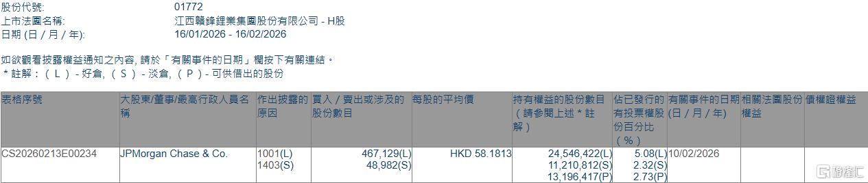核心事件概述 - 2026年2月10日,JPMorgan Chase & Co. 增持赣锋锂业H股(01772.HK) 46.71万股,每股均价58.1813港元,涉及金额约2717.82万港元 [1] - 此次增持后,JPMorgan Chase & Co. 持有的好仓股份数目增至2454.642万股,持股比例由4.98%上升至5.08% [1] 权益披露详情 - 披露期间为2026年1月16日至2026年2月16日 [2] - 根据表格数据,JPMorgan Chase & Co. 通过“好仓”持有24,546,422股,占比5.08% [2] - 同时,JPMorgan Chase & Co. 通过“淡仓”持有11,210,812股,占比2.32% [2] - 此外,JPMorgan Chase & Co. 还持有13,196,417股“可供借出的股份”,占比2.73% [2]