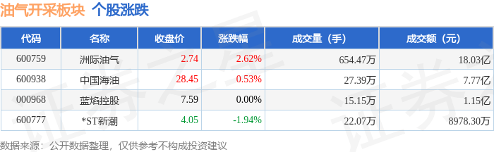 证券之星消息,11月7日油气开采板块较上一交易日上涨0.18%,洲际油气领涨。当日上证指数报收于 3997.56,下跌0.25%。深证成指报收于13404.06,下跌0.36%。油气开采板块个股涨跌见下表: | 代码 | 名称 | | 主力净流入 (元) | | | 主力净占比 游资净流入 (元) 游资净占比 散户净流入 (元) 散户净占比 | | | | --- | --- | --- | --- | --- | --- | --- | --- | --- | | 000968 蓝焰控股 | | | -471.90万 | -4.09% | -664.92万 | -5.76% | 1136.82万 | 9.85% | | 600938 中国海滩 | | -934.33万 | | -1.20% | -669.56万 | -0.86% | 1603.89万 | 2.06% | | 600759 洲际油气 | | | -2131.90万 | -1.18% | 7749.10万 | 4.30% | -5617.20万 | -3.12% | | 600777 | *ST新潮 | | -2786.73万 | -31.04 ...
