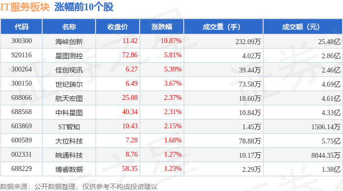 证券之星消息,11月7日IT服务板块较上一交易日下跌1.79%,佳华科技领跌。当日上证指数报收于 3997.56,下跌0.25%。深证成指报收于13404.06,下跌0.36%。IT服务板块个股涨跌见下表: | 代码 | 名称 | 收盘价 | 涨跌幅 | 成交量(手) | 成交额(元) | | --- | --- | --- | --- | --- | --- | | 300300 | 海峡创新 | 11.42 | 10.87% | 232.09万 | 25.48亿 | | 920116 | 屋图测控 | 72.86 | 5.81% | 4.02万 | 2.86 Z | | 300264 | 佳创视讯 | 6.27 | 5.38% | 39.44万 | 2.46亿 | | 300150 | 世纪瑞尔 | 6.49 | 3.67% | 73.58万 | 4.69亿 | | 688066 | 航天宏图 | 25.08 | 2.37% | 18.60万 | 4.61亿 | | 688568 | 中科星图 | 40.34 | 2.31% | 10.84万 | 4.33亿 | | 603869 | ST智知 | 10. ...