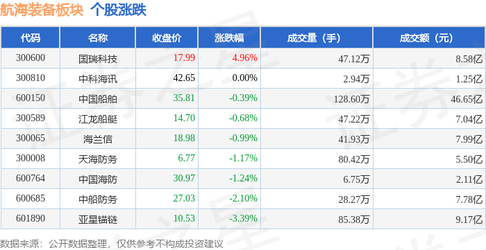 证券之星消息,11月7日航海装备板块较上一交易日下跌0.6%,亚星锚链领跌。当日上证指数报收于 3997.56,下跌0.25%。深证成指报收于13404.06,下跌0.36%。航海装备板块个股涨跌见下表: | 代码 | 名称 | 收盘价 | 涨跌幅 | 成交量(手) | 成交额(元) | | --- | --- | --- | --- | --- | --- | | 300600 | 国瑞科技 | 17.99 | 4.96% | 47.12万 | 8.58 Z | | 300810 | 中模范 | 42.65 | 0.00% | 2.94万 | 1.25亿 | | 600150 | 中国船舶 | 35.81 | -0.39% | 128.60万 | 46.65 亿 | | 300589 | 江龙船艇 | 14.70 | -0.68% | ﻞ 47.22万 | 7.04亿 | | 300065 | 海兰信 | 18.98 | -0.99% | 41.93万 | 7.99亿 | | 300008 | 天海防务 | 6.77 | -1.17% | 80.42万 | 5.50亿 | | 600764 | 中国海防 | ...