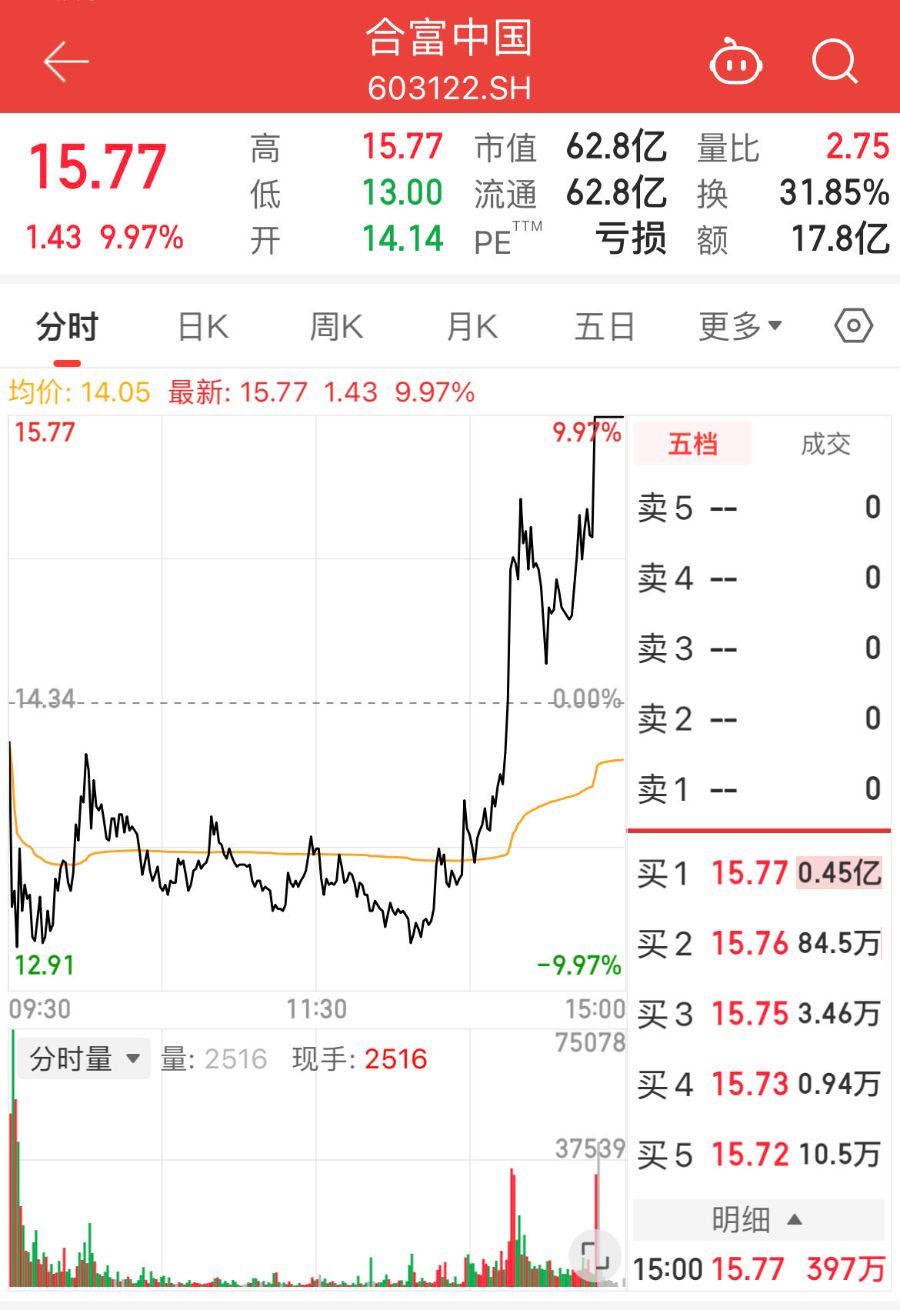2025年11月7日,大牛股合富中国(603122)(603122.SH)尾盘直线拉升封死涨停板,截至收盘报15.77元/股,涨幅9.97%,豪取9 连板。这一走势发生在公司密集提示非理性炒作风险之后,形成股价狂欢与业绩承压的强烈反差。 合富中国 603122.SH 15.77 市值 62.8亿 量比 2.75 高 15.77 31.85% 62.8亿 13.00 fffe 流通 换 1.43 9.97% 17.8亿 14.14 亏损 开 额 PE™M 分时 日K 五日 周K 車零。 均价:14.05 最新:15.77 1.43 9.97% 15.77 9.97% 五档 成交 0 卖5 -- 0 卖 4 -- 卖3 -- 0 -14.34 0.00% 卖2 -- 0 卖1 -- 0 买1 15.77 0.45亿 买2 15.76 84.5万 -9.97% 12.91 11:30 15:00 买 3 15.75 3.46万 09:30 75078 分时量 ▼ 量: 2516 现手: 2516 买 4 15.73 0.94万 37539 买 5 15.72 10.5万 明细 ▲ 15:00 15.77 397万 ...
