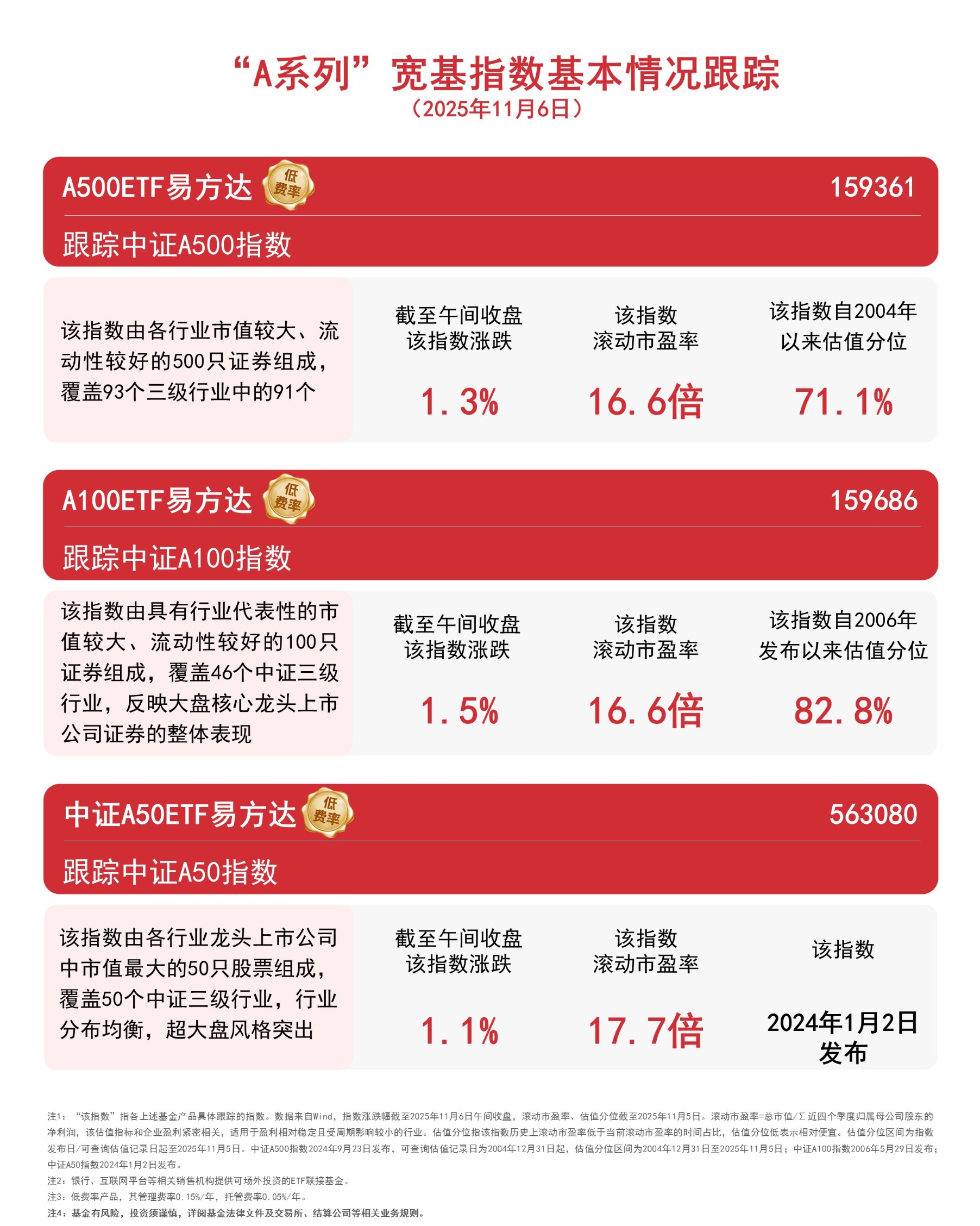 截至午间收盘,中证A500指数上涨1.3%,中证A100指数上涨1.5%,中证A50指数上涨1.1%,A500ETF易方达(159361) 期资金流入态势明显,近10个交易日"吸金"超14亿元。 "A系列" 员基指数基 (2025年11月6日) 中证A50FTF易 跟踪中证A500指数 该指数由各行业市值较大、流 动性较好的500只证券组成, 覆盖93个三级行业中的91个 截至午间收盘 该指数涨跌 1. 3% A100ETF易方达 跟踪中证A100指数 该指数由具有行业代表性的市 值较大、流动性较好的100只 证券组成,覆盖46个中证三级 行业,反映大盘核心龙头上市 公司证券的整体表现 截至午间收盘 该指数涨跌 1. 5% A500ETF易方达 (文章来源:每日经济新闻) ...