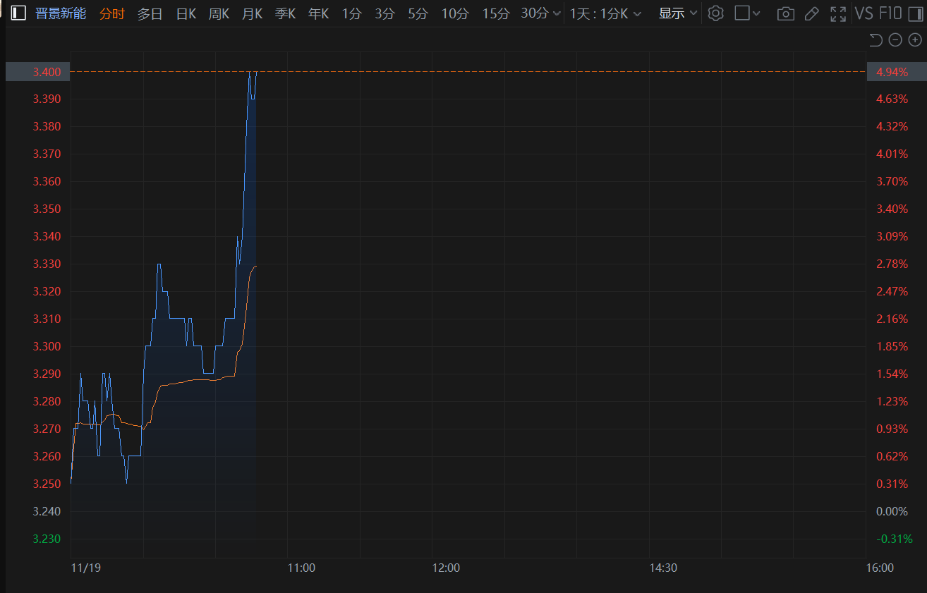 晋景新能近年来用绿色创新技术赋能产品与服务,致力于为全球客户提供一站式的绿色能源基建解决方案。现有的绿色基建升级业务包括建筑节能改造一体 化服务、电动车充电设施基建与安装、新型储能系统的开发与应用等。同时,集团将通过绿色能源的可持续解决方案包括对动力电池的处置与循环利用,持 续赋能核心业务与产品。 | 晋景新能 | 分时 多日 日K 周K 月K 季K 年K 1分 3分 5分 10分 15分 30分v 1天:1分K・ | | | 显示。 | | --- | --- | --- | --- | --- | | 3.400 | | | | | | 3.390 | | | | | | 3.380 | | | | | | 3.370 | | | | | | 3.360 | | | | | | 3.350 | | | | | | 3.340 | | | | | | 3.330 | | | | | | 3.320 | | | | | | 3.310 | | | | | | 3.300 | | | | | | 3.290 | | | | | | 3.280 | | | | | | 3.270 | | | | | | 3.26 ...
