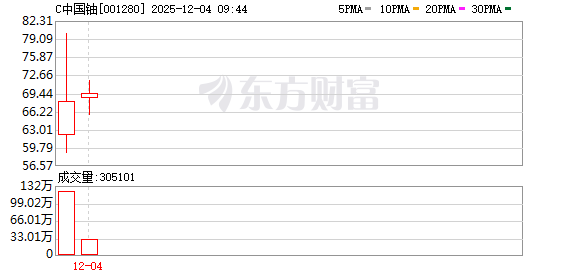 交易公开信息数据显示,该股上市首日,龙虎榜上榜的前五大买卖营业部合计成交8.36亿元,其中,买 入成交额为6.28亿元,卖出成交额为2.08亿元,合计净买入4.19亿元。(数据宝) 近期上市新股首日融资融券交易明细 | 代码 | 简称 | 上市日期 | 上市首日涨跌 | 上市首日融资余额 | 占流通市值比 | 上市首日融券余额 | | --- | --- | --- | --- | --- | --- | --- | | | | | (%) | (万元) | 例(%) | (万元) | | 001280 | C中国 铀 | 2025.12.03 | 280.04 | 31330.13 | 2.91 | 0.00 | | 920035 | 精创电 气 | 2025.12.02 | 330.74 | 318.10 | 0.47 | 0.00 | | 920124 | 南特科 技 | 2025.11.27 | 183.03 | 1058.93 | 0.56 | 0.00 | | 001233 | 海安集 团 | 2025.11.25 | 74.00 | 7929.33 | 2.68 | 0.00 | | 92009 ...