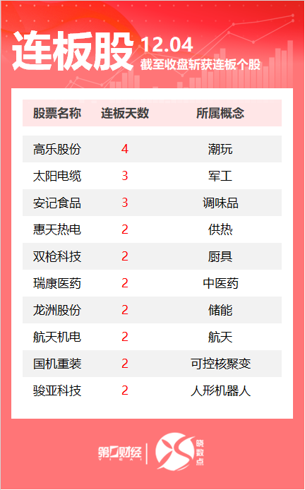 每经AI快讯,12月4日,市场焦点股海王生物(6板)高开9.96%,大消费板块海欣食品(6板)低开 0.41%、同庆楼(2板)高开1.79%,端侧AI概念股道明光学(5板)竞价跌停,福蓉科技(3板)低开 8.42%,商业航天概念股顺灏股份(4板)低开0.75%、银河电子(4天3板)低开1.84%,发电机概念股 杰瑞股份(4天3板)平开,并购重组的和顺石油(5天3板)平开,福建本地股太阳电缆(2板)竞价涨 停、安记食品(2板)高开5.66%。 ...