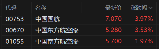 | 代码 | 名称 | 最新价 涨跌幅 √ | | --- | --- | --- | | 00753 | 中国国航 | 7.070 3.97% | | 00670 | 中国东方航空股 | 5.280 3.53% | | 01055 | 中国南方航空股 | 5.700 1.97% | 港股频道更多独家策划、专家专栏,免费查阅>>责任编辑:栎树 12月29日,近日连续回调的港股三大指数再度活跃,中国国航一度涨近5%刷新近期阶段新高,中国东 方航空目前涨3.5%,中国南方航空涨2%。 消息上,元旦假期临近,2026年元旦机票市场预计会"量价齐升"。在海南封关及元旦假期临近等多重驱 动下,旅游板块近期持续活跃。 今年元旦假期民航市场热度较往年明显上升。多家航空公司在热门冰雪游航线上增投了运力,目前机票 销售进度已超其它航线。相关人士表示,深圳工作的人去北方旅游,东北地区的游客也流行来深圳旅 游。深圳机场往返东北客流量,最近已同比增长了4.3%。 ...
