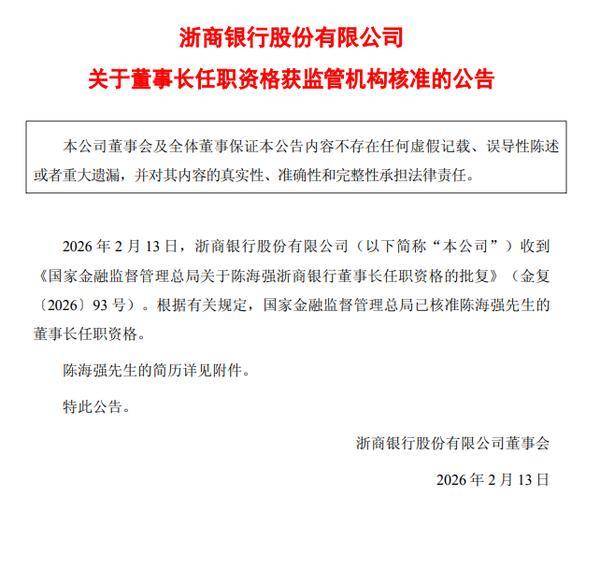 公司高管任命 - 国家金融监督管理总局已正式核准陈海强担任浙商银行董事长的任职资格 [1] - 陈海强出生于1974年10月,拥有硕士学位及正高级经济师职称 [1] - 陈海强在浙商银行内部晋升路径完整,曾任宁波分行行长、杭州分行行长、行长助理、副行长、首席风险官、党委副书记及行长等职务 [1] - 陈海强拥有跨银行从业经验,曾任职于国家开发银行杭州分行及招商银行宁波分行 [1] - 陈海强目前兼任浙江省国际商会常务副会长 [1]