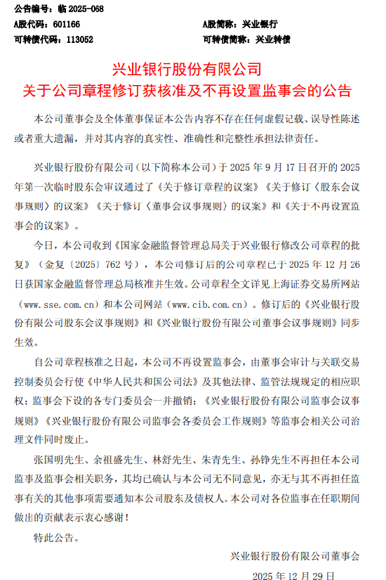 12月29日金融一线消息,兴业银行公告称,今日,公司收到《国家金融监督管理总局关于兴业银行修改 公司章程的批复》(金复〔2025〕762 号),本公司修订后的公司章程已于 2025 年 12 月 26日获国家金 融监督管理总局核准并生效。 自公司章程核准之日起,公司不再设置监事会,由董事会审计与关联交易控制委员会行使《中华人民共 和国公司法》及其他法律、监管法规规定的相应职权;监事会下设的各专门委员会一并撤销;《兴业银 行股份有限公司监事会议事规则》《兴业银行股份有限公司监事会各委员会工作规则》等监事会相关公 司治理文件同时废止。 张国明、余祖盛、林舒、朱青、孙铮不再担任公司监事及监事会相关职务,其均已确认与公司无不同意 见,亦无与其不再担任监事有关的其他事项需要通知公司股东及债权人。 责任编辑:王馨茹 12月29日金融一线消息,兴业银行公告称,今日,公司收到《国家金融监督管理总局关于兴业银行修改 公司章程的批复》(金复〔2025〕762 号),本公司修订后的公司章程已于 2025 年 12 月 26日获国家金 融监督管理总局核准并生效。 自公司章程核准之日起,公司不再设置监事会,由董事会审计与关联交易控制委 ...