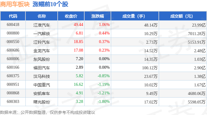 证券之星消息,12月29日商用车板块较上一交易日下跌0.33%,中集车辆领跌。当日上证指数报收于 3965.28,上涨0.04%。深证成指报收于13537.1,下跌0.49%。商用车板块个股涨跌见下表: 从资金流向上来看,当日商用车板块主力资金净流出1.85亿元,游资资金净流入651.62万元,散户资金净 流入1.79亿元。商用车板块个股资金流向见下表: | 代码 | 名称 | | 主力净流入(元) | 主力净占比 游资净流入 (元) | | 游资净占比 散户净流入(元) | | 散户净占比 | | --- | --- | --- | --- | --- | --- | --- | --- | --- | | 600686 | 金龙汽车 | | > 290.77万 | 1.17% | 1878.38万 | 7.58% | -2169.14万 | -8.75% | | 000800 | 一汽解放 | | 182.52万 | 2.60% | -150.26万 | -2.14% | -32.26万 | -0.46% | | 000550 江铃汽车 | | | -114.89万 | -2.23% | 352.19万 ...