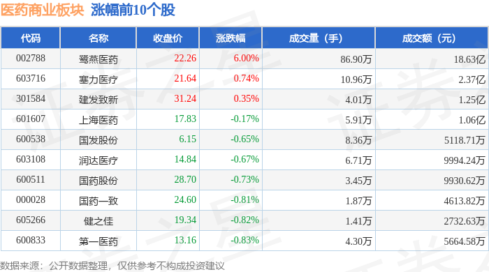 证券之星消息,12月29日医药商业板块较上一交易日下跌1.82%,漱玉平民领跌。当日上证指数报收于 3965.28,上涨0.04%。深证成指报收于13537.1,下跌0.49%。医药商业板块个股涨跌见下表: | 代码 | 名称 | 收盘价 | 涨跌幅 | 成交量(手) | 成交额(元) | | --- | --- | --- | --- | --- | --- | | 002788 | 登陆失药 | 22.26 | 6.00% | 86.90万 | 18.63亿 | | 603716 | 塞力医疗 | 21.64 | 0.74% | 10.96万 | 2.37亿 | | 301584 | 建发致新 | 31.24 | 0.35% | 4.01万 | 1.25亿 | | 601607 | 上海医药 | 17.83 | -0.17% | 5.91万 | 1.06亿 | | 600538 | 国发股份 | 6.15 | -0.65% | 8.36万 | 5118.71万 | | 603108 | 润达医疗 | 14.84 | -0.67% | 6.71万 | 9994.24万 | | 600511 | 国药股份 | ...
