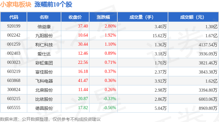 证券之星消息,12月29日小家电板块较上一交易日下跌1.04%,苏 泊 尔领跌。当日上证指数报收于 3965.28,上涨0.04%。深证成指报收于13537.1,下跌0.49%。小家电板块个股涨跌见下表: | 代码 | 名称 | 主力净流入(元) | 主力净占比 游资净流入(元) | | 游资净占比 散户净流入(元) | | 散户净占比 | | --- | --- | --- | --- | --- | --- | --- | --- | | 603486 | 科沃斯 | 2724.02万 | 6.27% | 1808.06万 | 4.16% | -4532.08万 | -10.44% | | 603355 莱克电气 | | 2587.82万 | 11.32% | 1726.73万 | 7.56% | -4314.55万 | -18.88% | | 688169 石头科技 | | 2251.43万 | 2.94% | 1456.39万 | 1.90% | -3707.82万 | -4.84% | | 920199 | 倍益康 | 996.33万 | 7.65% | 47.45万 | 0.36% | -90.5 ...
