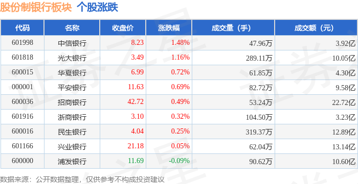 证券之星消息,11月10日股份制银行板块较上一交易日上涨0.5%,中信银行领涨。当日上证指数报收于 4018.6,上涨0.53%。深证成指报收于13427.61,上涨0.18%。股份制银行板块个股涨跌见下表: | 代码 | 名称 | 收盘价 | 涨跌幅 | 成交量(手) | 成交额(元) | | --- | --- | --- | --- | --- | --- | | 601998 | 中信银行 | 8.23 | 1.48% | 47.96万 | 3.92 Z | | 601818 | 光大银行 | 3.49 | 1.16% | 289.11万 | 10.05亿 | | 600015 | 华夏银行 | 6.99 | 0.72% | 61.85万 | 4.30亿 | | 000001 | 平安银行 | 11.63 | 0.69% | 82.72万 ﻝ | 9.58亿 | | 600036 | 招商银行 | 42.72 | 0.49% | 53.24万 | 22.72亿 | | 601916 | 浙商银行 | 3.10 | 0.32% | 104.50万 | 3.23亿 | | 600016 | 民生银行 | ...