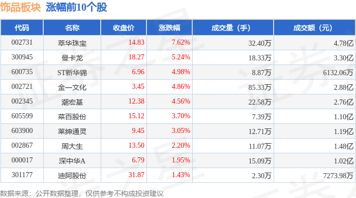 证券之星消息,11月10日饰品板块较上一交易日上涨2.54%,萃华珠宝领涨。当日上证指数报收于 4018.6,上涨0.53%。深证成指报收于13427.61,上涨0.18%。饰品板块个股涨跌见下表: | 代码 | 名称 | 收盘价 | 涨跌幅 | 成交量(手) | 成交额(元) | | --- | --- | --- | --- | --- | --- | | 002731 | 萃华珠宝 | 14.83 | 7.62% | 32.40万 | 4.78亿 | | 300945 | 曼卡龙 | 18.27 | 5.24% | 18.33万 | 3.30亿 | | 600735 | ST新华锦 | 6.96 | 4.98% | 1 8.87万 | 6132.06万 | | 002721 | 金一文化 | 3.45 | 4.86% | - 85.33万 | 2.887Z | | 002345 | 潮宏基 | 12.38 | 4.56% | 22.58万 | 2.76亿 | | 605599 | 菜自股份 | 15.12 | 3.70% | 7.39万 | 1.10亿 | | 603900 | 英细通灵 | 9.45 ...