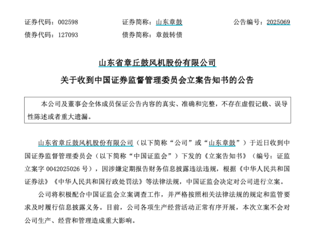 【导读】山东章鼓涉嫌财报信披违法违规被立案 中国基金报记者 忆山 2025年12月31日晚间,山东章鼓发布公告称,公司于近日收到中国证监会下发的《立案告知书》,因涉嫌定期报告财务信息披露违法违规,根据《中华人 民共和国证券法》《中华人民共和国行政处罚法》等法律法规,中国证监会决定对公司进行立案。 | | | 山东章鼓表示,公司将积极配合中国证监会立案调查工作,并严格按照相关法律法规的规定和监管要求及时履行信息披露义务。目前,公司各项生产经营 活动正常有序开展,本次立案不会对公司生产、经营和管理造成重大影响。 此前因信披违规等被责令改正 一是关联交易审议及信息披露违规。2024年半年报关联交易、2024年年报关联交易和关联方应收应付款项披露不准确;2020年至2024年个别关联交易达到 审议标准未及时履行审议程序和信息披露义务。 二是募集资金使用违规。2024年使用募集资金购买非保本理财产品;现金管理购买的4只产品未能在董事会授权的管理期限内全额赎回;在募集资金置换 相关募投项目先期投入时,将募集资金到账后继续以自有资金支付的募投项目支出一并置换;个别募投项目未从募集资金专户直接支付相关支出。 三是公司治理不规 ...