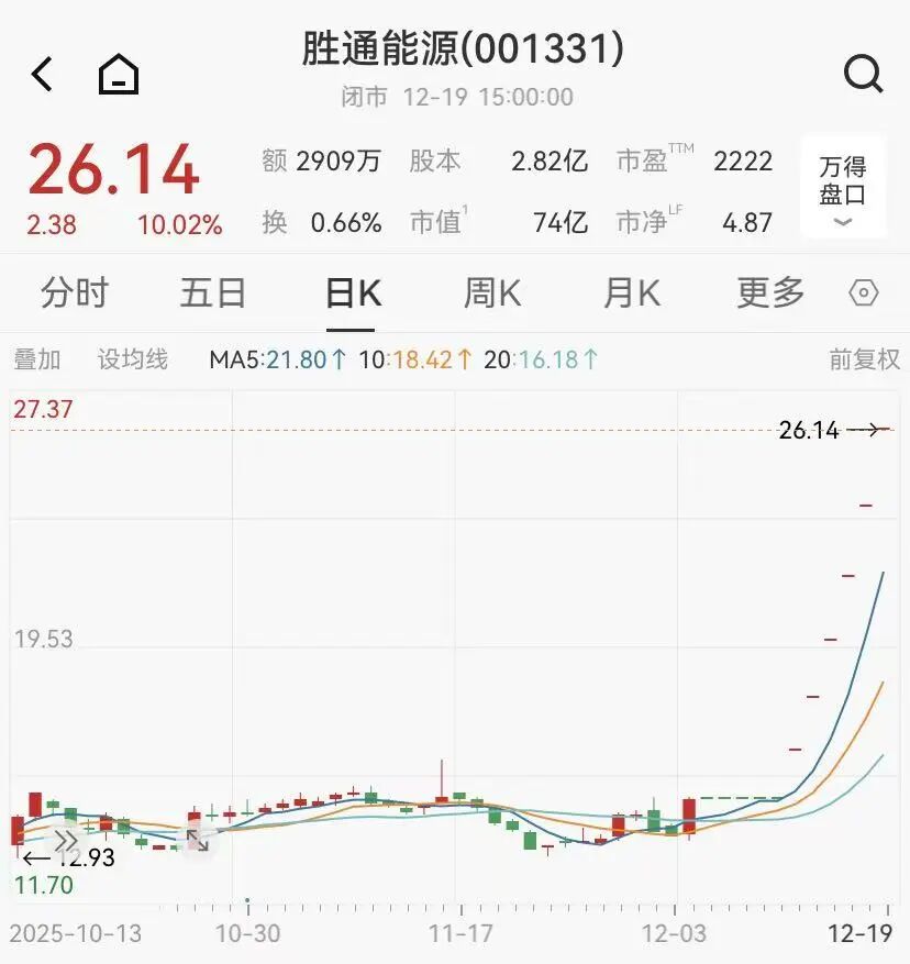 炒股就看金麒麟分析师研报,权威,专业,及时,全面,助您挖掘潜力主题机会! 12月19日,A股液化天然气物流龙头胜通能源(001331)再度涨停,续创历史新高。至此,该股已连续 6个交易日涨停。本周市场超2900股上涨,24股涨幅超30%。其中,胜通能源涨幅最大。 面对股价连续涨停,胜通能源于12月16日发布股票交易异常波动公告,并对相关事项进行核查说明。 胜通能源股价"起飞",或源于前几天刚刚公布的控股权变更方案。 12月11日,胜通能源(001331.SZ)公告一系列控制权变更事项,商用特种机器人企业七腾机器人及其 关联方或斥巨资入主。 据21世纪经济报道发现,在A股IPO节奏偏慢,而港股IPO又"大排长龙"的当下,协议转让与控制权变 更,成为了许多科技企业IPO"曲线救国"的手段。 又一个上纬新材?胜通能源六连板,16亿易主特种机器人龙头 彼时,关于智元机器人筹划借壳上纬新材实现上市的观点不绝于耳。尽管智元与上纬新材方面再三声明 并提示风险,称短期无借壳计划,上纬新材股价依旧不断计入智元机器人重组上市之预期。 截至12月19日收盘,上纬新材股价报98.10元/股,较此前7元/股左右股价上涨14倍,最高则一 ...