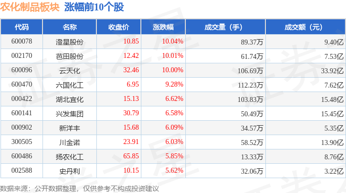 证券之星消息,11月6日农化制品板块较上一交易日上涨3.47%,澄星股份领涨。当日上证指数报收于 4007.76,上涨0.97%。深证成指报收于13452.42,上涨1.73%。农化制品板块个股涨跌见下表: | 代码 | 名称 | 收盘价 | 涨跌幅 | 成交量(手) | 成交额(元) | | | --- | --- | --- | --- | --- | --- | --- | | 600078 | 澄星股份 | 10.85 | 10.04% | 89.37万 | | 9.40亿 | | 002170 | 芭田股份 | 12.42 | 10.01% | 61.74万 | | 7.53亿 | | 600096 | 云天化 | 32.46 | 10.00% | 106.69万 | | 33.92亿 | | 600470 | 六国化工 | 6.95 | 9.28% | 112.23万 | | 7.62亿 | | 000422 | 湖北直化 | 15.13 | 6.62% | 103.83万 | | 15.48 乙 | | 600141 | 兴发集团 | 30.79 | 6.58% | 50.49万 | | 15. ...