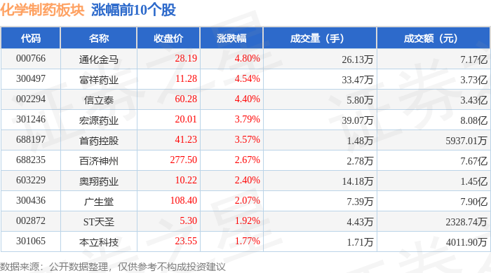 证券之星消息,11月6日化学制药板块较上一交易日下跌0.01%,向日葵领跌。当日上证指数报收于 4007.76,上涨0.97%。深证成指报收于13452.42,上涨1.73%。化学制药板块个股涨跌见下表: | 代码 | 名称 | 收盘价 | 涨跌幅 | 成交量(手) | 成交额(元) | | --- | --- | --- | --- | --- | --- | | 000766 | 通化金马 | 28.19 | 4.80% | 26.13万 | 7.17亿 | | 300497 | 富祥药业 | 11.28 | 4.54% | 33.47万 | 3.73亿 | | 002294 | 信立泰 | 60.28 | 4.40% | 5.80万 | 3.43(乙 | | 301246 | 宏源药业 | 20.01 | 3.79% | 39.07万 | 8.08亿 | | 688197 | 首药控股 | 41.23 | 3.57% | 1.48万 | 5937.01万 | | 688235 | 自济神州 | 277.50 | 2.67% | 2.78万 | 7.67亿 | | 603229 | 奥翔药业 | 10.2 ...