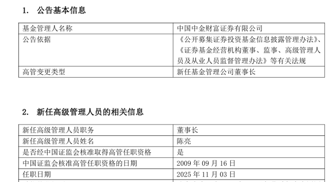 | 新任高级管理人员职务 | 董事长 | | --- | --- | | 新任高级管理人员姓名 | 陈亮 | | 是否经中国证监会核准取得高管任职资格 | 是 | | 中国证监会核准高管任职资格的日期 | 2009年09月16日 | | 任职日期 | 2025年11月03日 | 公开信息显示,中国中金财富证券有限公司(以下简称中金财富)是中国国际金融股份有限公司的全资 子公司。 根据中金公司半年报,截至2025年6月30日,中金财富总资产为1933.7亿元,净资产为202亿元;2025年 上半年,实现营业收入38.21亿元,营业利润为13.02亿元,净利润为9.88万元。 11月5日,中金财富发布公告,任命陈亮为董事长,任职日期自2025年11月3日起。 据了解,中金财富原董事长高涛今年4月到龄退休。现任中金公司董事长陈亮,此次兼任中金财富董事 长职务,体现了股东方对其管理能力的认可。 陈亮是券商行业的"老兵",曾任宏源证券股份有限公司副总经理、宏源期货有限公司董事长,申万宏源 集团股份有限公司和申万宏源证券有限公司党委委员、申万宏源集团股份有限公司总经理、申万宏源西 部证券有限公司执行董事、申万宏源西部证券 ...