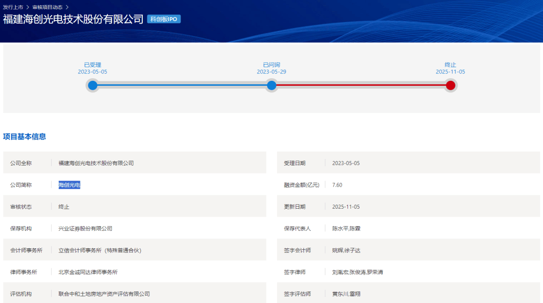 11月5日,上交所官网显示,因福建海创光电技术股份有限公司(以下简称:海创光电)以及保荐机构兴业证券撤回发行上市申请,根据《上海证券交易 所股票发行上市审核规则》第六十三条的有关规定,上交所决定终止对海创光电首次公开发行股票并在科创板上市的审核。 海创光电于2023年5月5日申请科创板IPO,经历一轮问询。 2022年、2023年、2024年,发行人实现营业收入分别为6.06亿元、8.33亿元、6.61亿元;同期实现扣非归母净利润分别为5600.75万元、1.14亿元、6221.44 万元。 | 公司全称 | 福建海创光电技术股份有限公司 | 受理日期 | 2023-05-05 | | --- | --- | --- | --- | | 公司简称 | 每创光电 | 融资金额(亿元) | 7.60 | | 市核状态 | 酱正 | 更新日期 | 2025-11-05 | | 保存机构 | 兴业证券股份有限公司 | 保存代表人 | 陈水平,陈霖 | | 会计师事务所 | 立信会计师事务所 (特殊普通合伙) | 签字会计师 | 姚辉,徐子达 | | 律师事务所 | 北京金诚同达律师事务所 | 签字律师 | 刘胤宏,张 ...