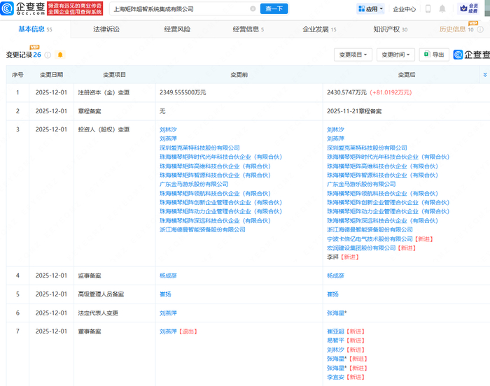 | | 扬遗有远见的商业传感 全国企业信用查询系 | 上海矩阵超智系统集成有限公司 | 0 道一下 | ■ 应用▼ 企业中心 | 13 0 | 出版 | | --- | --- | --- | --- | --- | --- | --- | | 基本信息 55 | | 法律诉讼 | 经营风险 经营信息 5 | 企业发展 15 知识产权 30 | | 历史信息 10 1 | | Alba 变更记录26 ● | | | | 变更项目 - 变即时间 = | REC ID | @ 企音音 | | 序号 | 变更日期 | 变更项目 | 交通前 | 李更后 | | 2) | | 1 | 2025-12-01 | 注册资本(金)变更 | 2349.555500万元 | 2430.5747万元(+81.0192万元) | | | | 2 | 2025-12-01 | 章程备家 | 无 | 2025-11-21直程备案 | | | | 3 | 2025-12-01 | 投资人(股权)变更 | 刘林沙 | 刘林汐 | | | | | | | 刘燕萍 | 刘燕萍 | | | | | | | 深圳温克莱特科技股份有限公司 | 深圳盛 ...