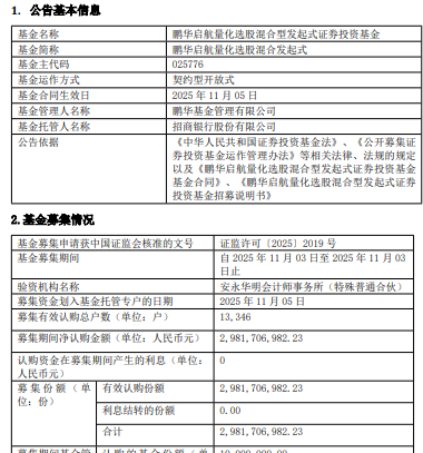 募集期间净认购金额2,981,706,982.23元,认购资金在募集期间产生的利息0元,募集份额合计 2,981,706,982.23份。 | 基金募集申请获中国证监会核准的文号 | | 证监许可(2025) 2019 号 | | --- | --- | --- | | 基金享集期间 | | 自 2025年 11月 03 日至 2025年 11月 03 日止 | | 验资机构名称 | | 安永华明会计师事务所(特殊普通合伙) | | 募集资金划入基金托管专户的日期 | | 2025 年 11月 05 日 | | 募集有效认购总户数(单位:户) | | 13. 346 | | 募集期间净认购金额(单位:人民币元) | | 2. 981. 706. 982. 23 | | 认购资金在募集期间产生的利息(单位: | | 0 | | 人民币元) | | | | 募集份額(单 | 有效认购份额 | 2. 981. 706, 982. 23 | | 何:份) | | | | 利息结转的份额 | | 0. 00 | | 合计 | | 2. 981. 706, 982. 23 | (责任编辑:康博) 中国经济网北京11月6日 ...