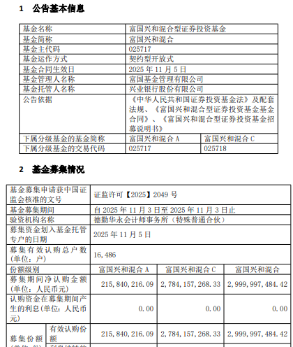 募集期间净认购金额2,999,997,484.42元,认购资金在募集期间产生的利息0元,募集份额合计 2,999,997,484.42份。 基金经理范妍曾任兴业证券股份有限公司助理策略分析师,安信证券股份有限公司高级策略分析 师,工银瑞信基金管理有限公司策略分析师,圆信永丰基金管理有限公司基金经理助理、基金经理、权 益总监、副总经理;自2024年5月加入富国基金管理有限公司,自2024年10月起历任资深权益基金经 理;现任富国基金权益投资部权益投资总监兼资深权益基金经理。 | 基金名称 | 富国兴和混合型证券投资基金 | | --- | --- | | 基金简称 | 富国兴和混合 | | 基金主代码 | 025717 | | 基金运作方式 | 契约型开放式 | | 基金合同生效日 | 2025年11月5日 | | 基金管理人名称 | 富国基金管理有限公司 | | 基金托管人名称 | 兴业银行股份有限公司 | | 公告依据 | 《中华人民共和国证券投资基金法》及配套 法规、《富国兴和混合型证券投资基金基金 合同》、《富国兴和混合型证券投资基金招 | | | 摹说明书》 | | 下属分级基金的基金简称 | 富国兴 ...