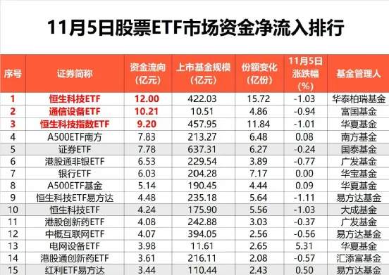 市场整体表现 - A股市场11月5日低开高走,探底回升转涨,市场韧性十足[1] - 电网设备板块集体爆发,光伏、储能板块拉升,量子科技概念股下挫[1] - 股票ETF市场总规模达4.61万亿元[3] - 当日股票ETF市场总份额增加141.71亿份,净流入资金达157.38亿元[3] 资金流入分析 - 港股市场ETF与行业主题ETF净流入居前,分别达64.97亿元与42.82亿元[4] - 恒生科技指数ETF净流入34.89亿元,其中华泰柏瑞恒生科技ETF净流入12亿元,华夏和易方达相关产品分别净流入9.2亿元和4.48亿元[4] - 近5日资金流入证券公司指数ETF超90亿元,流入恒生科技指数ETF超87亿元[5] - 具体产品看,通信设备ETF净流入10.21亿元,A500ETF南方净流入7.83亿元,证券ETF净流入7.78亿元[6] - 电网设备ETF表现突出,当日上涨5.31%,资金净流入3.98亿元[6] - 头部基金公司旗下ETF持续获资金青睐,易方达基金旗下ETF当日规模增加29.3亿元,2025年以来规模增加2179亿元[8] - 易方达旗下恒生科技ETF易方达和中概互联网ETF分别净流入近4.5亿元和4.1亿元,红利ETF易方达规模突破110亿元创历史新高[8] - 华夏基金旗下恒生科技指数ETF和A500ETF基金净流入分别达9.2亿元和5.14亿元[8] - 广发基金旗下港股通非银ETF连续5个交易日获加仓,规模超229亿元创历史新高,港股创新药ETF也持续获资金关注[8] 资金流出分析 - 沪深300指数ETF资金净流出居前,达7.91亿元[10] - 华泰柏瑞沪深300ETF和易方达沪深300ETF分别净流出7.13亿元和2.21亿元[11] - 行业主题ETF中,酒ETF净流出2.71亿元,机器人ETF易方达净流出2.23亿元,电池ETF净流出1.26亿元[11] 机构后市观点 - 政策面偏暖,“十五五”规划建议明确了科技自立自强、现代化产业体系建设等战略任务,为市场指明清晰投资方向[12] - 中美元首会晤释放“冲突暂缓、风险缓释”信号,为资本市场发展提供稳定有利的外部环境[12] - 外部风险可控,内部三季报A股盈利温和改善,市场风险偏好有望维持偏高位置,指数下行风险或有限[12] - 中期来看,科技有望成为未来几年经济建设和资本市场投资的重要主线[12]