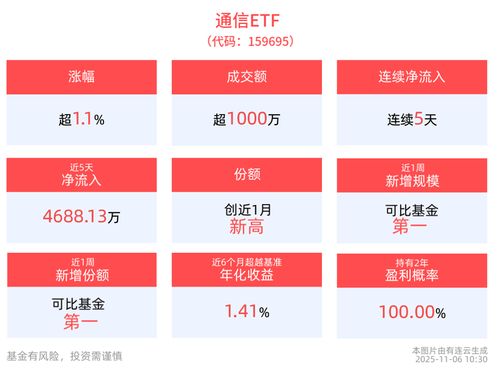 指数与ETF表现 - 截至2025年11月6日10:30,国证通信指数上涨0.94%,成分股仕佳光子、鼎通科技、中天科技、光库科技、锐捷网络分别上涨5.98%、5.46%、5.06%、4.56%、4.39% [1] - 通信ETF(159695)当日上涨1.15%,盘中一度涨超2%,近3月累计上涨31.59% [1][3] - 通信ETF近2年净值上涨104.55%,在指数股票型基金中排名26/2380,位居前1.09% [3] - 通信ETF自成立以来,最高单月回报为33.97%,最长连涨月数为6个月,连涨期间涨幅达76.40%,上涨月份平均收益率为7.18% [3] 市场流动性与资金动向 - 通信ETF盘中换手率为3.81%,成交额达1105.34万元 [3] - 通信ETF近1周规模增长3067.05万元,新增规模在可比基金中位列第一 [3] - 通信ETF最新份额达1.49亿份,创近1月新高,份额在可比基金中位居第一 [3] - 通信ETF近5日连续获得资金净流入,合计4688.13万元,最高单日净流入3524.80万元 [3] 光模块行业前景 - 光模块行业受算力需求催化,呈现量价齐升态势,市场规模迅速扩容,预计明年增速将高于今年 [3] - 据测算,2025/2026/2027年数通100G以上光模块市场规模将同比增长54%/69%/34%,市场规模分别达到144亿美元/244亿美元/327亿美元 [4] - 800G/1.6T技术升级路径明确,渗透率有望持续提升 [3] - 行业格局总体稳定,中国头部大厂占据核心份额,龙头效应有望加强 [4] 指数成分与权重 - 国证通信指数前十大权重股合计占比66.96% [4] - 前三大权重股为中际旭创(权重17.40%)、新易盛(权重16.08%)、中兴通讯(权重7.25%) [4][6] - 其他主要权重股包括中国电信(4.95%)、中国移动(4.89%)、中国联通(4.52%)、天孚通信(3.62%)、中天科技(2.59%)、传音控股(2.17%)、亨通光电(2.10%) [4][6]