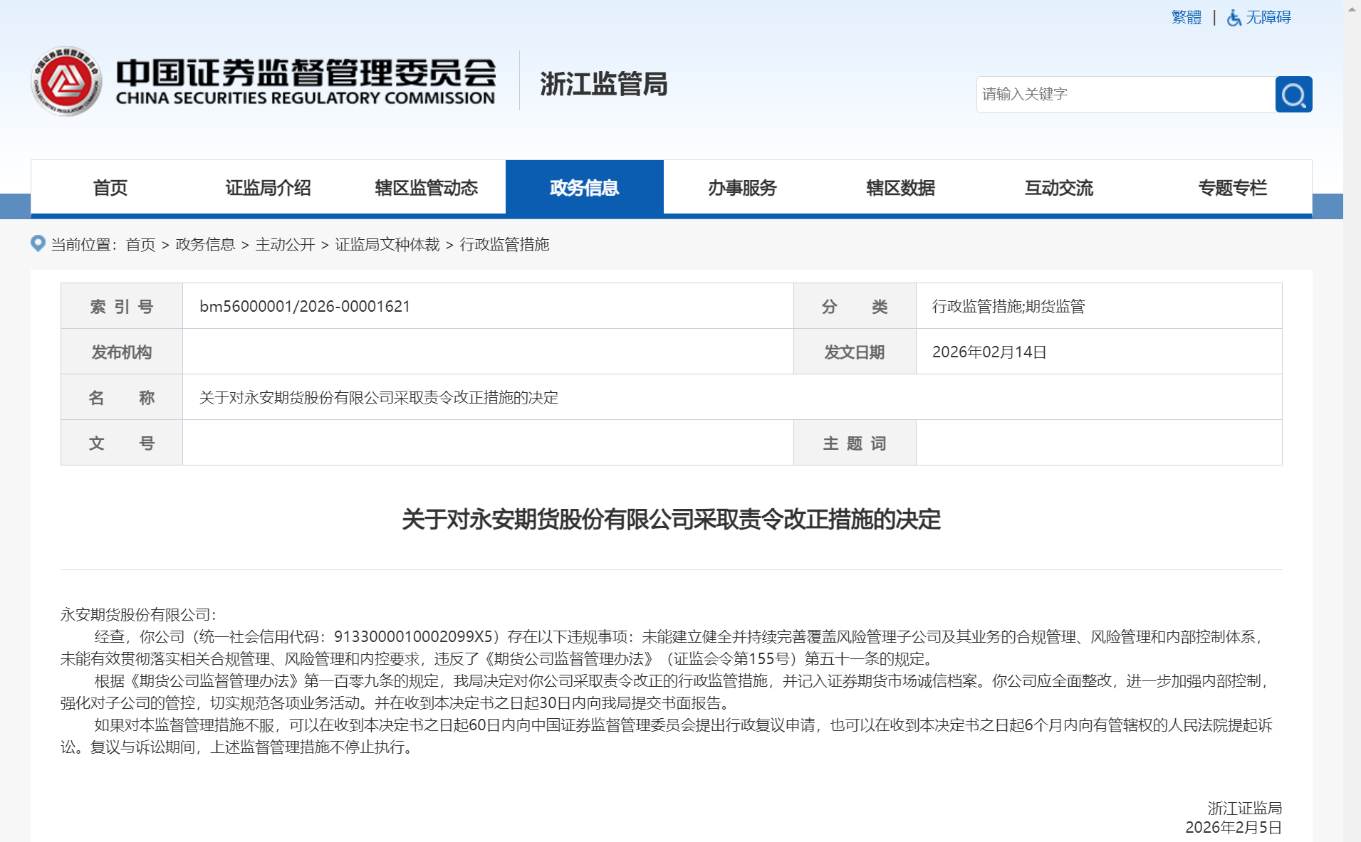 监管处罚 - 浙江证监局于2月14日对永安期货采取责令改正的行政监管措施,并记入证券期货市场诚信档案 [1] - 公司违规事项为未能建立健全并持续完善覆盖风险管理子公司及其业务的合规管理、风险管理和内部控制体系,未能有效贯彻落实相关要求,违反了《期货公司监督管理办法》第五十一条 [4] - 公司需在收到决定书之日起30日内提交书面整改报告,全面整改并强化对子公司的管控 [4] 高管责任 - 公司总经理马志伟因分管风险管理业务,对违规行为负有管理责任,被采取出具警示函的监管措施 [4][7] - 公司时任总经理黄志明、葛国栋因分管风险管理业务,对违规行为负有管理责任,被采取出具警示函的监管措施 [4][11][15] - 上述三名责任高管均需在收到决定书之日起30日内提交书面整改报告 [4] 公司背景与近期业绩 - 永安期货在业内被称为“期货一哥”,主营业务包括期货经纪、基金销售、资产管理、风险管理及境外金融服务等 [17] - 2025年前三季度,公司营业收入为83.55亿元,同比下降55.26% [17][19] - 2025年前三季度,公司归母净利润为4.75亿元,同比上升13.31% [17][19] - 2025年前三季度,公司经营活动产生的现金流量净额为-129.13亿元 [17][19] - 2025年第三季度单季,公司营业收入为27.98亿元,同比下降57.36% [17][19] - 2025年第三季度单季,公司归母净利润为3.05亿元,同比大幅上升173.39% [17][19]