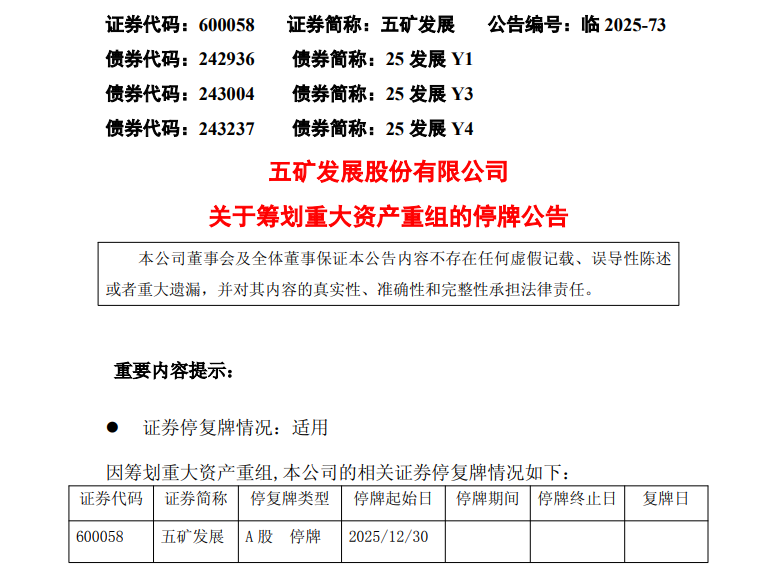 央企改革又见新案例。 五矿发展(600058)12月29日宣布,有望注入五矿矿业控股有限公司(简称"五矿矿业")股权、鲁中矿业有 限公司(简称"鲁中矿业")股权,本次交易预计构成重大资产重组。五矿发展今日股价出现涨停,公司股票 12月30日起停牌,预计不超过10 个交易日。 | 证券代码:600058 | 证券简称:五矿发展 公告编号:临2025-73 | | --- | --- | | 债券代码:242936 | 债券简称:25 发展 Y1 | | 债券代码:243004 | 债券简称:25 发展 Y3 | | 债券代码:243237 | 债券简称:25 发展 Y4 | "本次交易预计构成重大资产重组及关联交易,同时不构成实际控制人变更,不构成重组上市。"五矿发展方 面表示。 公开信息显示,五矿矿业是中国五矿金属矿产领域黑色矿业开发运营的核心企业。截至2025年10月,五矿矿 业资产总额195亿元,资源控制总量超过40亿吨。现有6座在产矿山,3座在建矿山,1座战略储备矿山(19亿 吨),铁矿石年生产能力1600万吨,铁精矿年生产能力600万吨。 值得注意的是,五矿矿业正在推进在建项目陈台沟铁矿,项目规划年产 ...