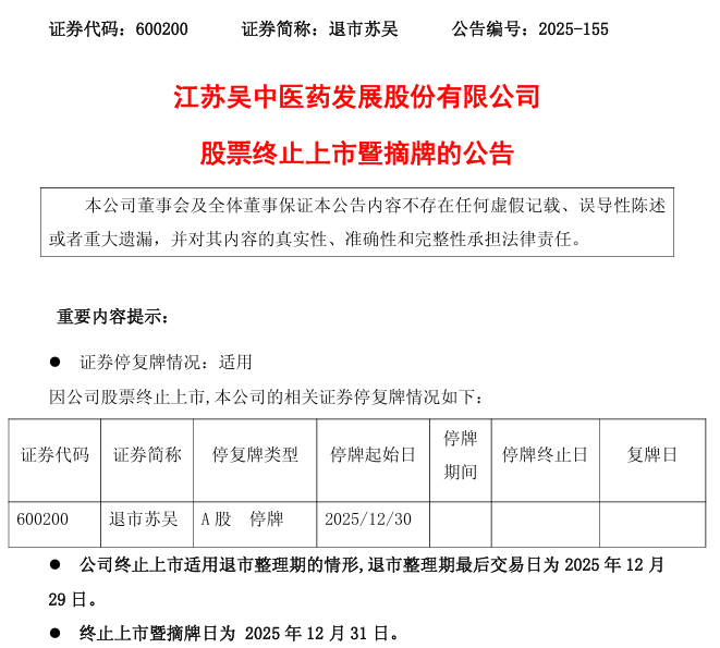 退市进程与时间安排 - 公司股票于2025年12月9日进入退市整理期交易,并于2025年12月29日交易满15个交易日,退市整理期结束 [1] - 上海证券交易所将在2025年12月31日对公司股票予以摘牌,终止上市 [1] - 公司股票将于2025年12月30日停牌,停牌前股价为0.29元/股,总市值为2.06亿元 [3] 退市后股份转让安排 - 公司股票终止上市后将转入全国中小企业股份转让系统(三板)的退市公司板块挂牌转让 [2] - 主办券商原则上应在摘牌后45个交易日内完成挂牌手续 [2] - 公司已聘请江海证券有限公司担任主办券商,负责办理相关股份转让、登记结算等事宜 [2] 退市原因与监管处罚 - 公司于2025年12月1日收到上海证券交易所出具的终止上市决定 [5] - 公司于2025年11月25日收到中国证监会《行政处罚决定书》,认定公司存在多项信息披露违法违规行为 [5] - 公司未如实披露实际控制人,2018年至2023年年度报告中关于实际控制人钱群英的记载存在虚假 [5] 财务造假具体事实 - 公司通过子公司与多家关联公司开展无商业实质的贸易业务,虚增营业收入、营业成本和利润 [6] - 2020年至2023年,公司分别虚增营业收入49526.32万元、46850.82万元、43074.52万元、37666.41万元,占当期披露营业收入的26.46%、26.39%、21.26%、16.82% [6] - 同期分别虚增营业成本48068.05万元、44823.70万元、41082.09万元、35544.47万元,占当期披露营业成本的37.08%、35.47%、28.40%、20.95% [6] - 同期分别虚增利润总额1458.27万元、2027.12万元、1992.42万元、2121.94万元,占当期披露利润总额的2.89%、51.65%、26.42%、29.81% [6] 关联方资金占用情况 - 公司通过支付无商业实质的贸易业务采购款等形式向关联方提供资金,形成非经营性资金占用 [7] - 公司未在2020年至2023年年度报告中披露上述关联方资金占用情况,导致年报存在重大遗漏 [7] - 截至2020年末、2021年末、2022年末、2023年末,关联方非经营性占用资金余额分别为12740.69万元、139262.91万元、154273.23万元、169260.71万元,占当期披露净资产的6.88%、74.20%、84.60%、96.09% [7]