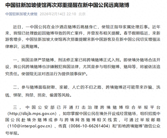 事件概述 - 中国驻新加坡大使馆发布消息,近日一名中国公民在新加坡金沙酒店赌博后跳楼身亡,使馆正指导家属处理后事 [1] - 近年来使馆已处理数起因赌博导致的死亡案件,并曾发布相关提醒 [1] - 春节假期临近,来新游客增多,使馆再次郑重提醒来新中国游客及在新中国公民增强法律意识,远离赌博 [1] 法律风险与政策 - 中国法律严禁赌博,刑法修正案已将跨境赌博正式入刑 [1] - 即使境外赌场合法开设,中国公民跨境赌博也涉嫌触犯中国法律,尤其是参与组织赌博、赌局等,将被依法追究责任 [1] - 使领馆无法对公民的违法行为提供领事保护 [1] 赌博的危害与关联风险 - 参与赌博面临财散、家破、人亡的不归之路 [1] - 跨境赌博还可能带来诈骗、洗钱、绑架、拘禁、拐卖、偷渡等风险 [1] 举报与求助渠道 - 中国公安部已开通打击治理跨境赌博综合举报平台 (http://dbjb.mps.gov.cn) [1] - 如掌握中国公民在境外开设或经营赌场,组织招揽中国公民赴境外赌博或参与跨境网络赌博相关线索,可通过举报邮箱 (110@interpol.gov.cn)、传真 (0086-10-66261404) 和"拒绝跨境赌博"微信公众号举报 [1] - 新加坡报警电话:999(当地拨打)或+65 62550000 [2] - 驻新加坡使馆领事保护与协助电话:+65 64750165 [2] - 外交部全球领事保护与服务应急呼叫中心电话:+86-10-12308或+86-10-65612308 [2]