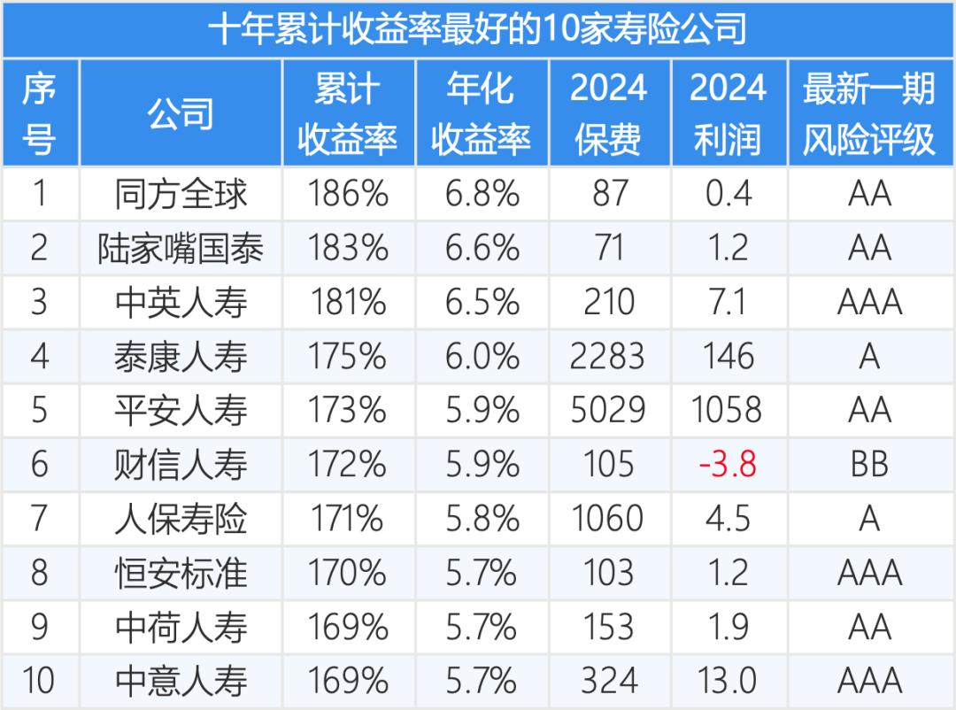 分千亿级规模/银行系/ 中资/外资分别展开 今天来整体比对一下 十年来这些寿险公司 投资收益哪家强 说明:本文共统计了40家公司 养老公司和健康险公司 由于属性不一样,未纳入统计 风险处置以及不足十年的公司 由于缺少完整数据,也不做统计 此外还有少数几家公司 部分数据缺失,未加入比对 ① 收益率十强 年化收益率前三强 都是合资公司 同方全球(6.8%) 陆家嘴国泰(6.6%) 中英人寿(6.5%) 第四和第五名 泰康人寿和平安人寿 人保寿险也很不错 排名第七 地方性寿险财信人寿 不仅投资收益强 也是前十中波动最小的 恒安标准、中荷、中意 也都跻身十强 | | | | 十年累计收益率最好的10家寿险公司 | | | | | --- | --- | --- | --- | --- | --- | --- | | ਤਿ | 公司 | 累计 | 年化 | 2024 | 2024 | 最新一期 | | 号 | | 收益率 | 收益率 | 保費 | 利润 | 风险评级 | | 1 | 同方全球 | 186% | 6.8% | 87 | 0.4 | AA | | 2 | 陆家嘴国泰 | 183% | 6.6% | 71 | ...