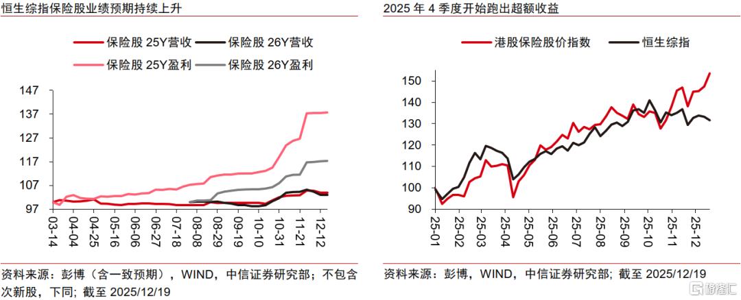 本文来自格隆汇专栏:中信证券研究 作者:陈采赋 张君翔 薛姣 童成墩 徐广鸿 港股保险今年表现随行就市,但基本面显著优于市场整体;且无论是在金融板块内还是红利资产框架下比较,轮动空间存在显著机遇。虽然港股保险相较 A股今年已有明显超额收益,但无论是静态对比还是结合盈利能力回归,港股中资保险的估值修复仍大有可为,尤其在这轮修复行情中仍尚未充分计价盈 利能力改善,继续提供港股中资保险表现的空间。周期视角来看,保险公司正步入资产负债表良性扩张阶段,政策端反内卷助力降本增效,产品端分红险 转型降低经营压力,渠道端银保渠道推动储蓄存款持续转化,投资端增配权益提升市场定价权,保险股料将开启新一轮上行周期。 ▍港股保险业绩加速,轮动空间存机遇。 相较港股今年主要靠估值扩张驱动的行情,港股保险行情具备明确的基本面支撑,截至2025年12月12日,2025年的盈利预期相较今年3月中上调了 37.5%,同期恒生综指25Y盈利预期下调3.5%;2026年港股保险的盈利预期则相较8月初上调了17.1%,同期恒生综指在材料与保险贡献下的26Y盈利预期 企稳。但港股保险全年的估值修复明显不及市场整体。在金融板块内比较,港股保险在2023 ...