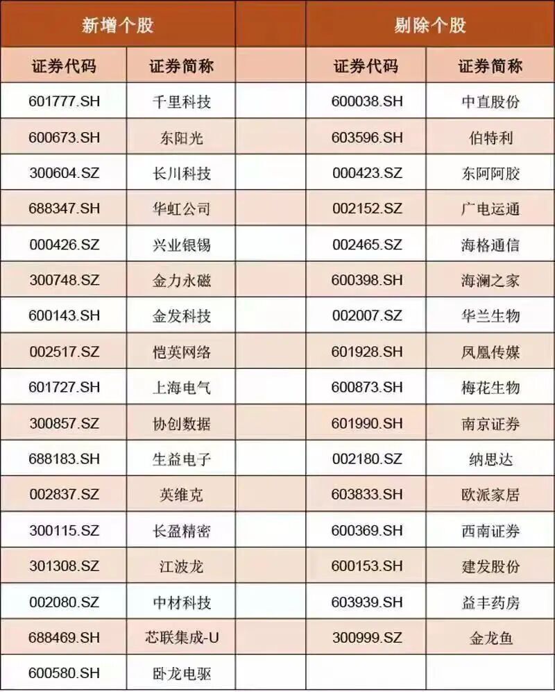 11月6日早间,国际指数编制公司MSCI公布了11月指数审核变更结果。在本次调整中,MSCI中国A股指数新纳入 17只标的,剔除16只。本次调整结果将于11月24日收盘后生效。 A股分红模范生东阿阿胶,是被剔除的其中之一。 据悉,每次调整的依据主要为客观量化指标,如市值和流动性等。 | 新增个股 | | 剔除个股 | | | --- | --- | --- | --- | | 证券代码 | 证券简称 | 证券代码 | 证券简称 | | 601777.SH | 千里科技 | 600038 SH | 中直股份 | | 600673.SH | 东阳光 | 603596 SH | 伯特利 | | 300604.SZ | 长川科技 | 000423.SZ | 东阿阿胶 | | 688347.SH | 华虹公司 | 002152.SZ | 广电运通 | | 000426.SZ | 兴业银锡 | 002465.SZ | 海格通信 | | 300748.SZ | 金力永磁 | 600398. SH | 海澜之家 | | 600143.SH | 金发科技 | 002007.SZ | 华兰生物 | | 002517.SZ | 恺 ...