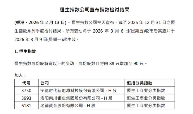 恒生指数成份股调整 - 恒生指数成份股数目由88只增加至90只 [1] - 新加入宁德时代、洛阳钼业和老铺黄金三家公司 [1] - 剔除中升集团控股有限公司 [1] 新纳入公司详情 - 宁德时代新能源科技股份有限公司 - H 股,股票代码3750,被纳入恒生工商业分类指数 [3] - 洛阳栾川钼业集团股份有限公司 - H 股,股票代码3993,被纳入恒生工商业分类指数 [3] - 老铺黄金股份有限公司 - H 股,股票代码6181,被纳入恒生工商业分类指数 [3]